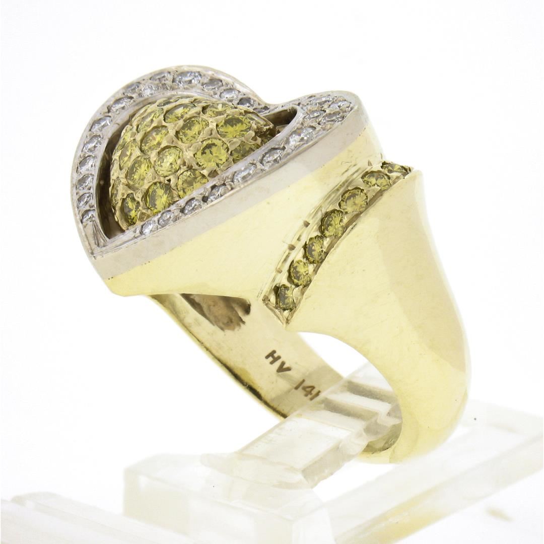 A vintage yellow & white gold heart ring, with 47 round brilliant cut fancy yellow natural diamonds (VS1/VS2 ; 1.15ctw), and 29 round brilliant cut natural diamonds (G/H - VS1/VS2 ; 0.45ctw). The ring is size 6.5, weighs a total of 13.28 grams, and measures 15.70mm wide.