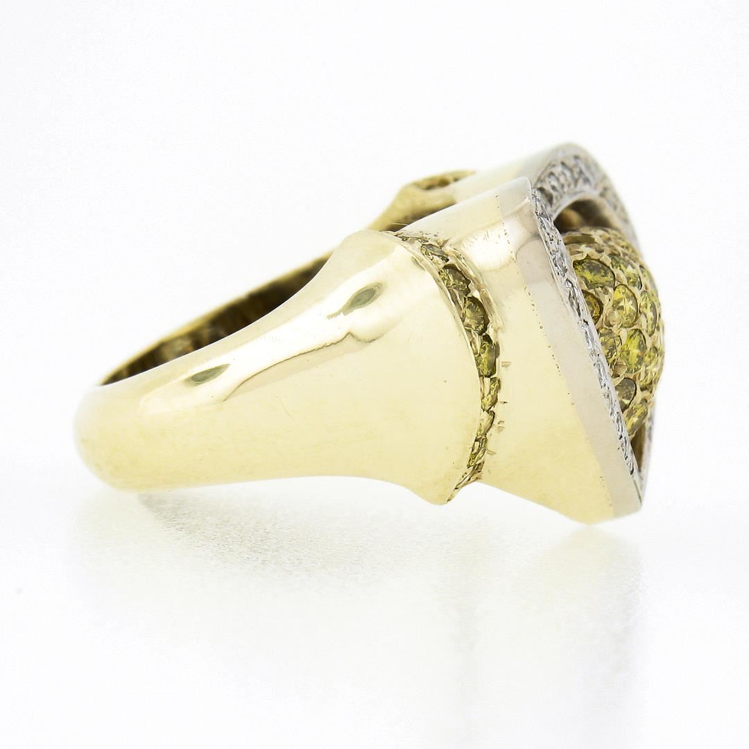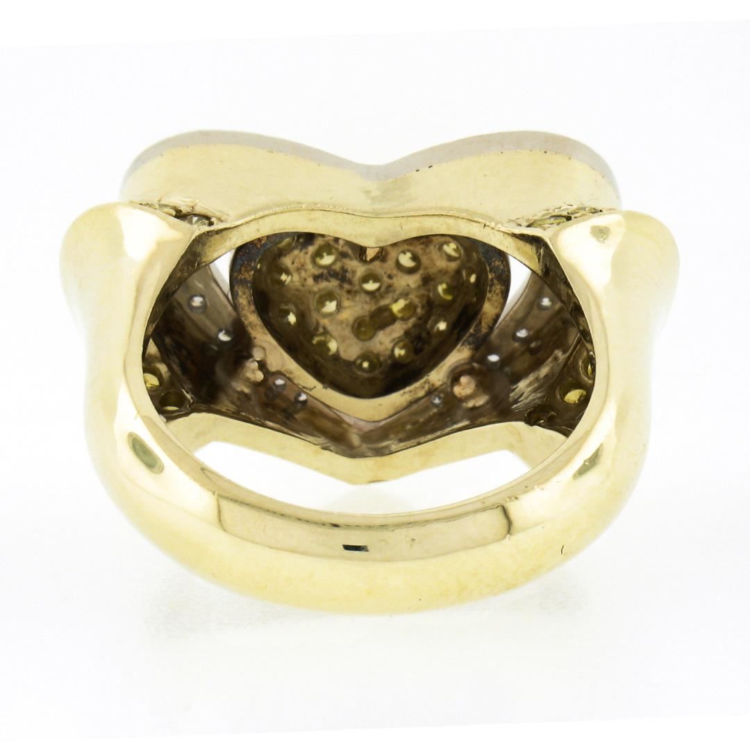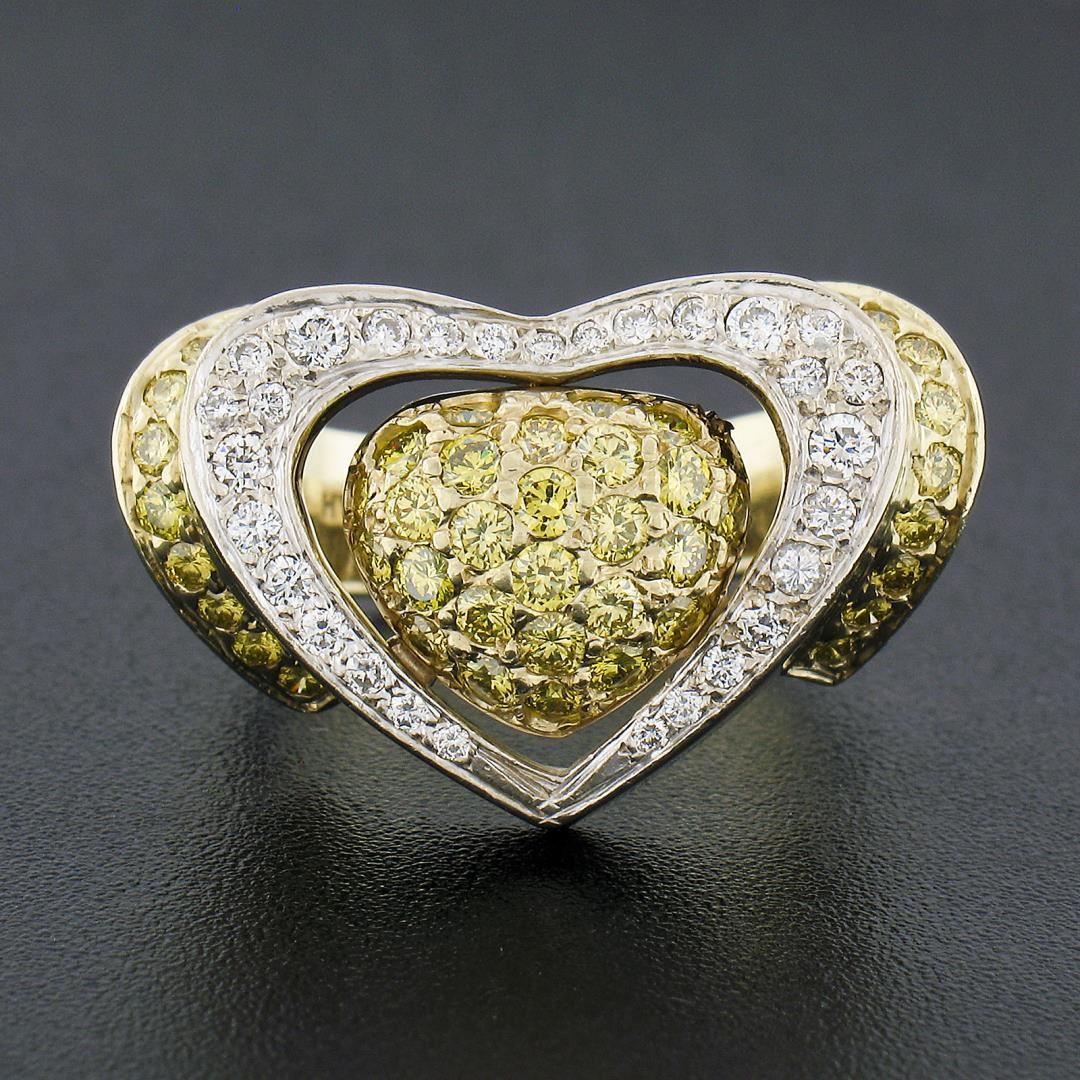 A vintage yellow & white gold heart ring, with 47 round brilliant cut fancy yellow natural diamonds (VS1/VS2 ; 1.15ctw), and 29 round brilliant cut natural diamonds (G/H - VS1/VS2 ; 0.45ctw). The ring is size 6.5, weighs a total of 13.28 grams, and measures 15.70mm wide.
