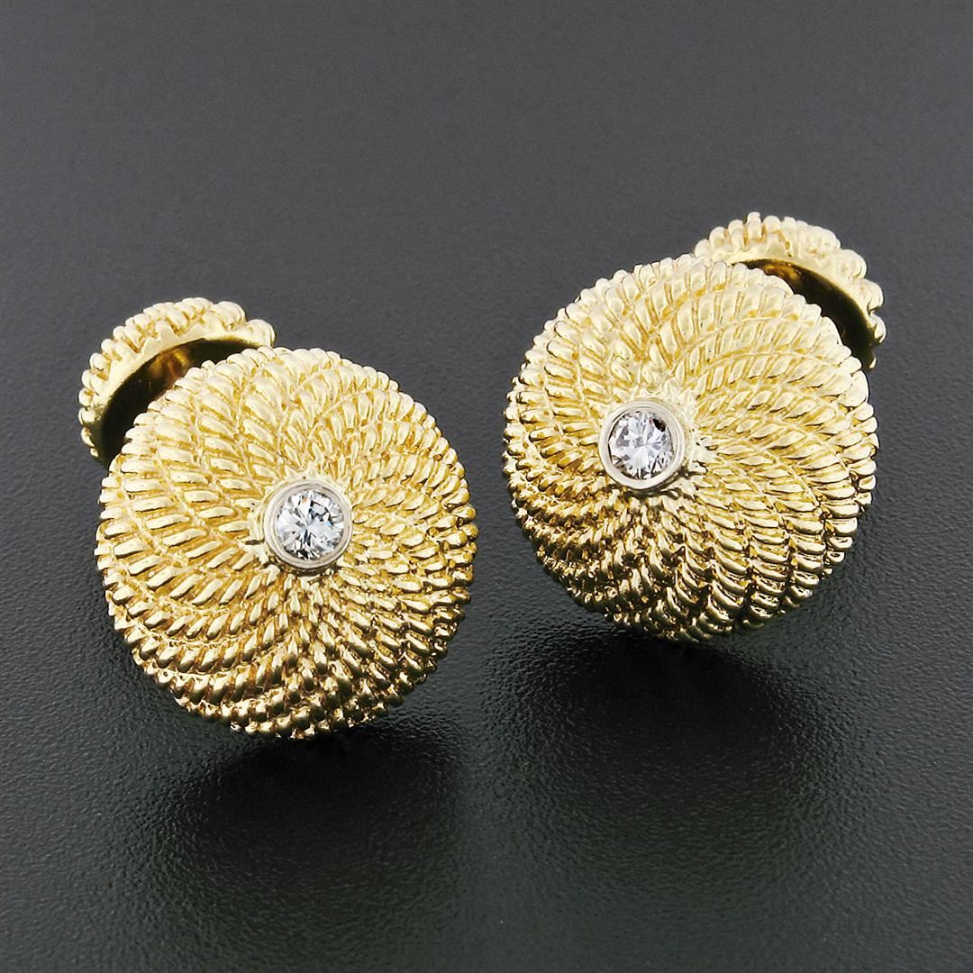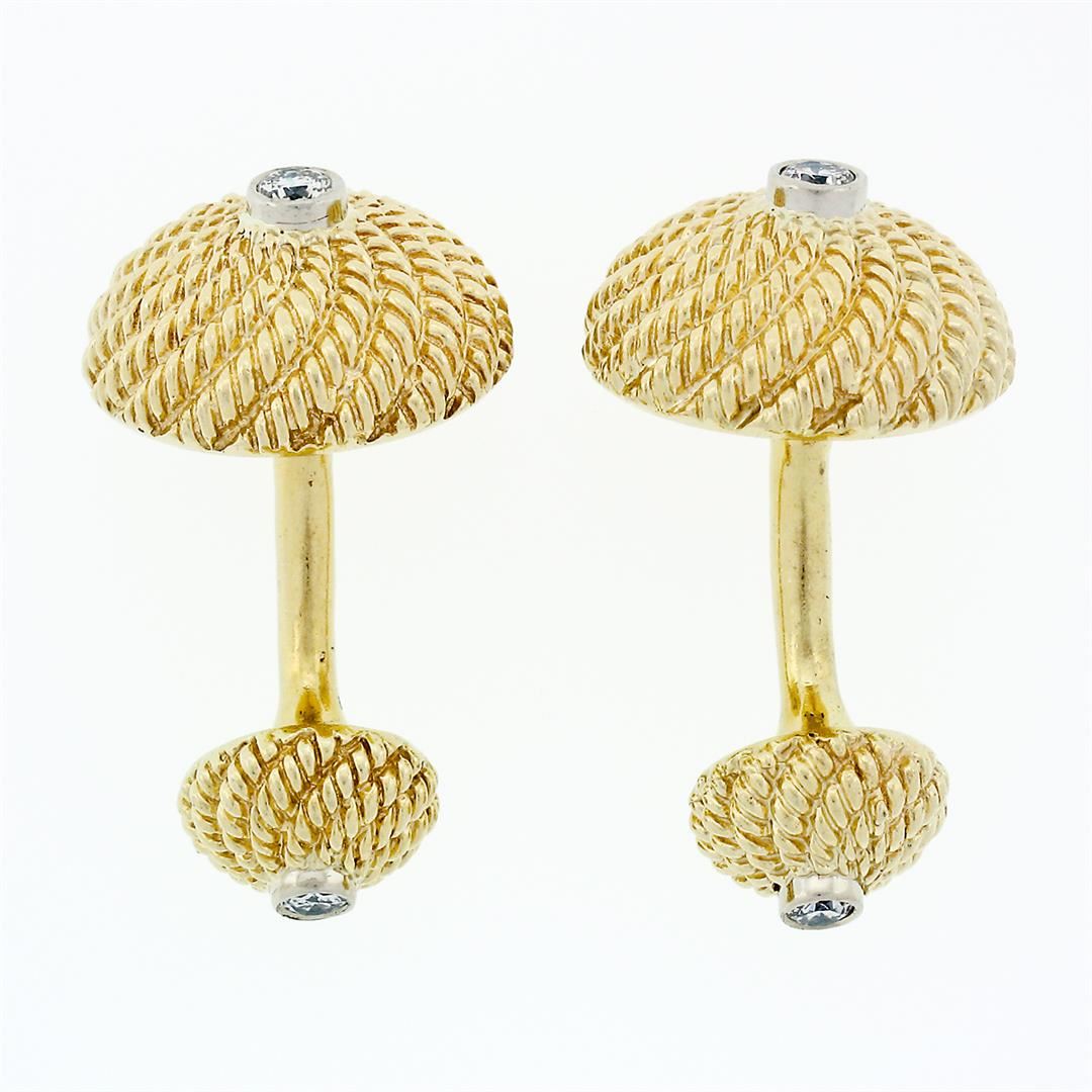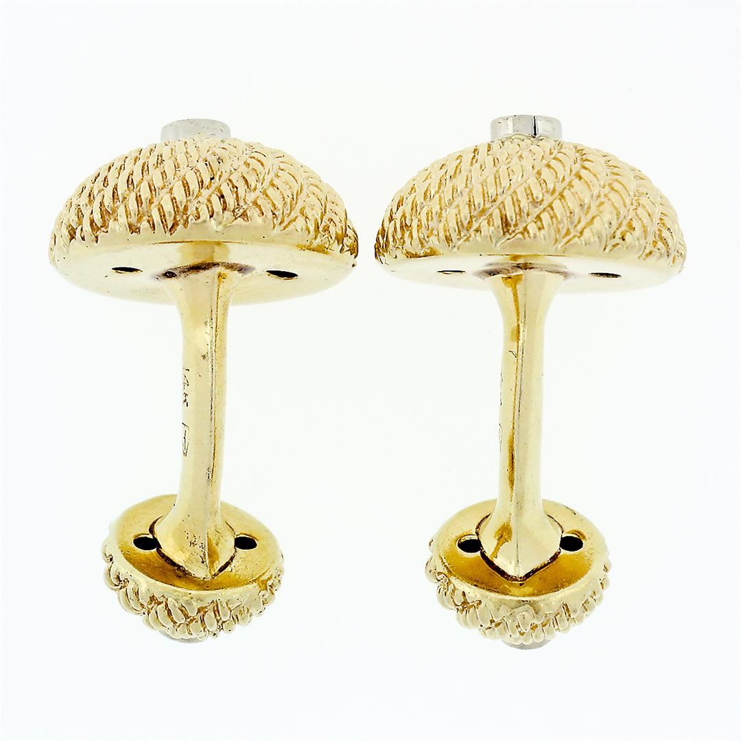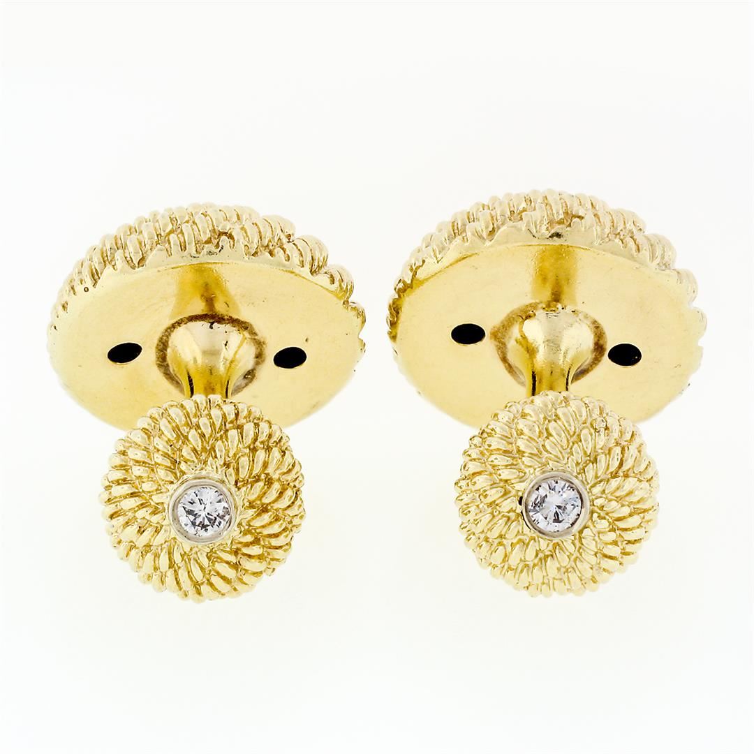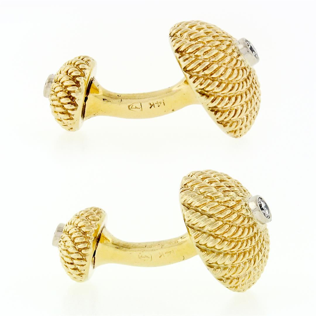A pair of solid 14k two tone gold cufflinks, with 4 round brilliant cut natural diamonds (G/H - SI1 ; 0.30ctw). These cuff links have a barbell design with a clearance of 10.32mm to 17.30mm, weigh a total of 17.00 grams, and the front panels measure 16.70mm in diameter.