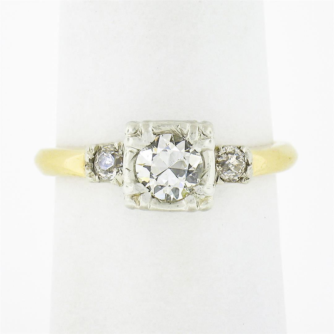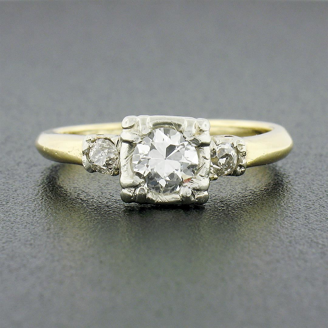 A solid 14k yellow & white gold engagement ring, with 3 old cut natural diamonds (H/I - VS2/SI1 ; 0.68ctw). The ring is size 6.5, weighs a total of 2.78 grams, and measures 6.80mm wide.