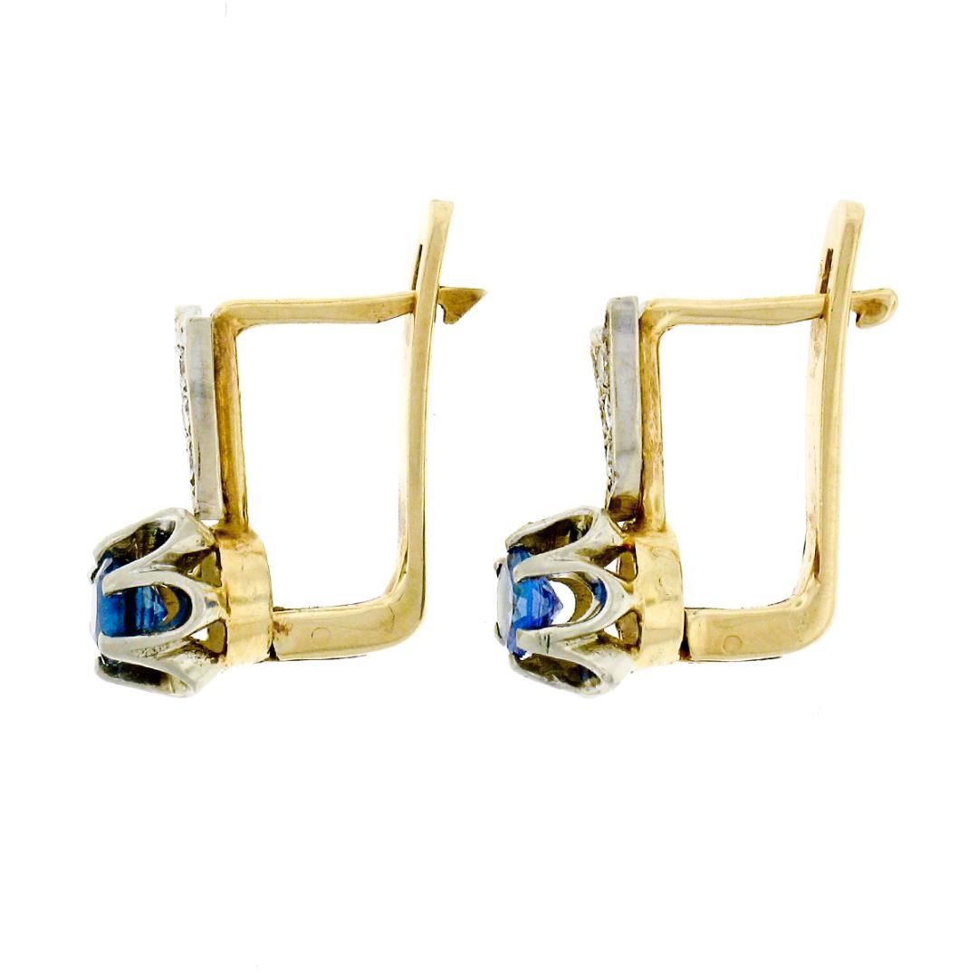 A vintage solid 14k yellow & white gold flower drop earrings, featuring 2 round cut natural sapphires (1.00ctw), and 6 round transitional cut natural diamonds (H/I - VS1/VS2 ; 0.12ctw ). The earrings measure approximately 16.46x8.25mm and weigh a total of 4.85 grams.