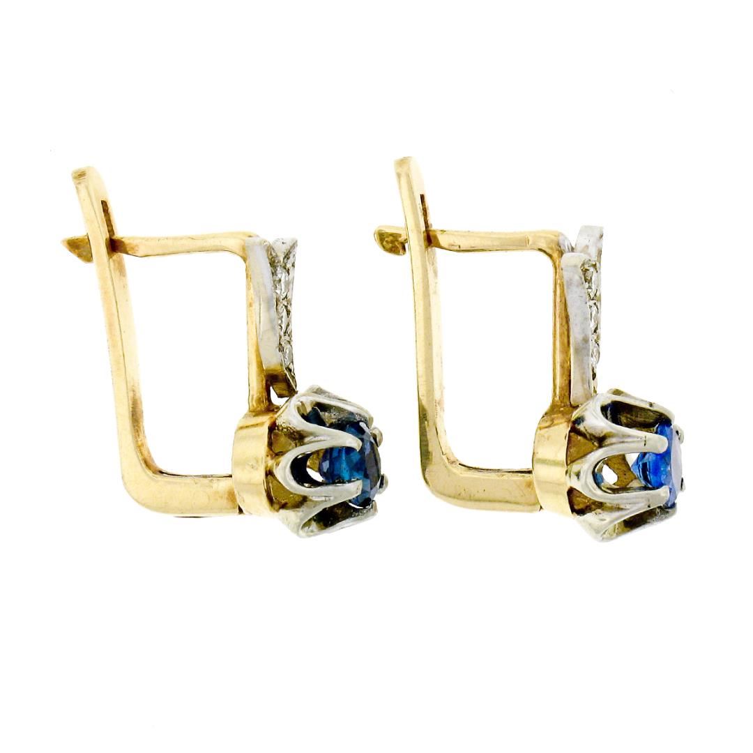 A vintage solid 14k yellow & white gold flower drop earrings, featuring 2 round cut natural sapphires (1.00ctw), and 6 round transitional cut natural diamonds (H/I - VS1/VS2 ; 0.12ctw ). The earrings measure approximately 16.46x8.25mm and weigh a total of 4.85 grams.