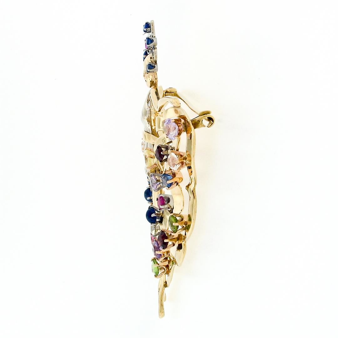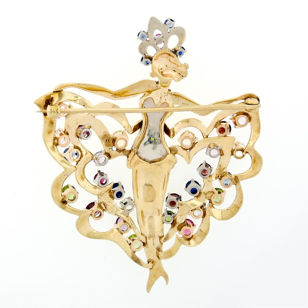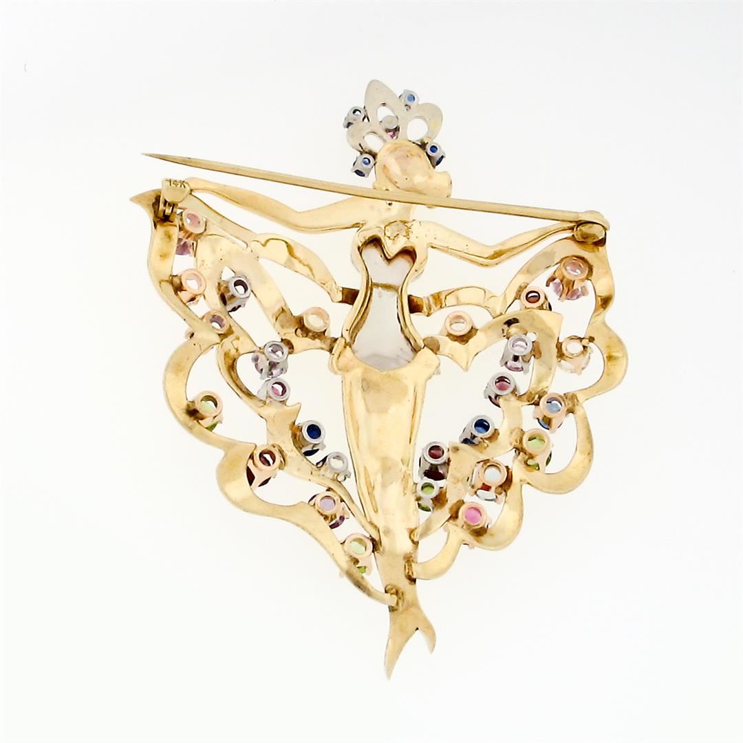 A solid 14k two tone gold ballerina dancing woman brooch, with 31 round cut mutli stones (2.48mm to 4.90mm). Measures 75.82x59mm and weighs a total of 26.84 grams.