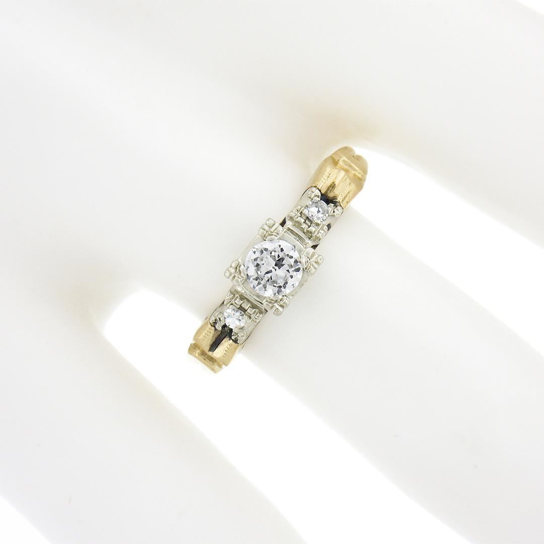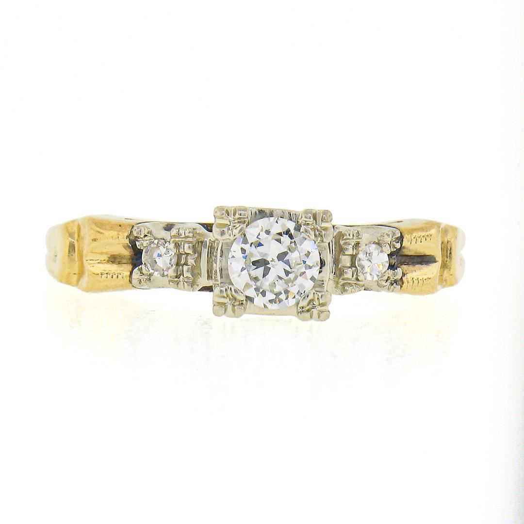 A vintage solid 14k yellow & white gold solitaire engagement ring, with 1 old european cut natural diamond (H - VS2 ; 0.26ct ), & 2 old single cut natural diamonds (G/H - VS2/SI1 ; 0.01ctw). . The ring is size 6.5, weighs a total of 2.23 grams, and measures 5mm wide.