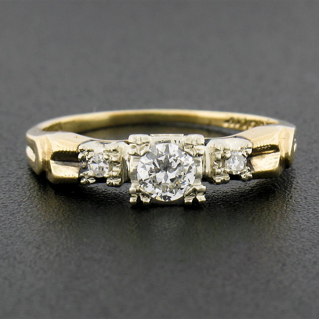 A vintage solid 14k yellow & white gold solitaire engagement ring, with 1 old european cut natural diamond (H - VS2 ; 0.26ct ), & 2 old single cut natural diamonds (G/H - VS2/SI1 ; 0.01ctw). . The ring is size 6.5, weighs a total of 2.23 grams, and measures 5mm wide.