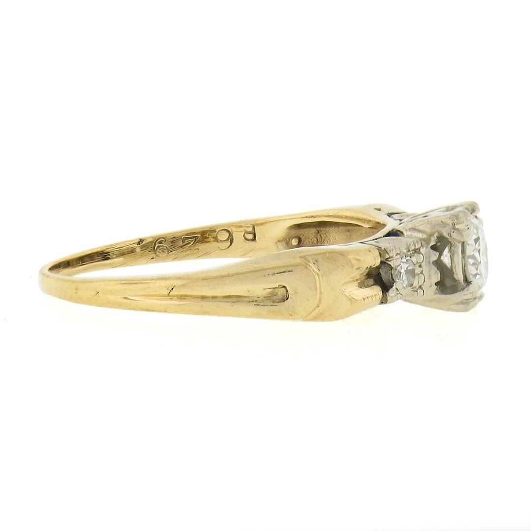 A vintage solid 14k yellow & white gold solitaire engagement ring, with 1 old european cut natural diamond (H - VS2 ; 0.26ct ), & 2 old single cut natural diamonds (G/H - VS2/SI1 ; 0.01ctw). . The ring is size 6.5, weighs a total of 2.23 grams, and measures 5mm wide.