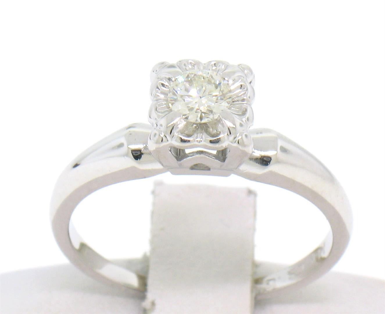 Vintage 14k White Gold 0.18ctw Round Diamond Illusion Set Solitaire Ring. Please see photos and description for all available information. A vintage solid 14k white gold engagement ring, featuring 1 round brilliant cut natural diamond (I - VS2; 0.18CT). The ring is size 5.0, weighs a total of 2.20 grams, and measures 6.04mm wide.