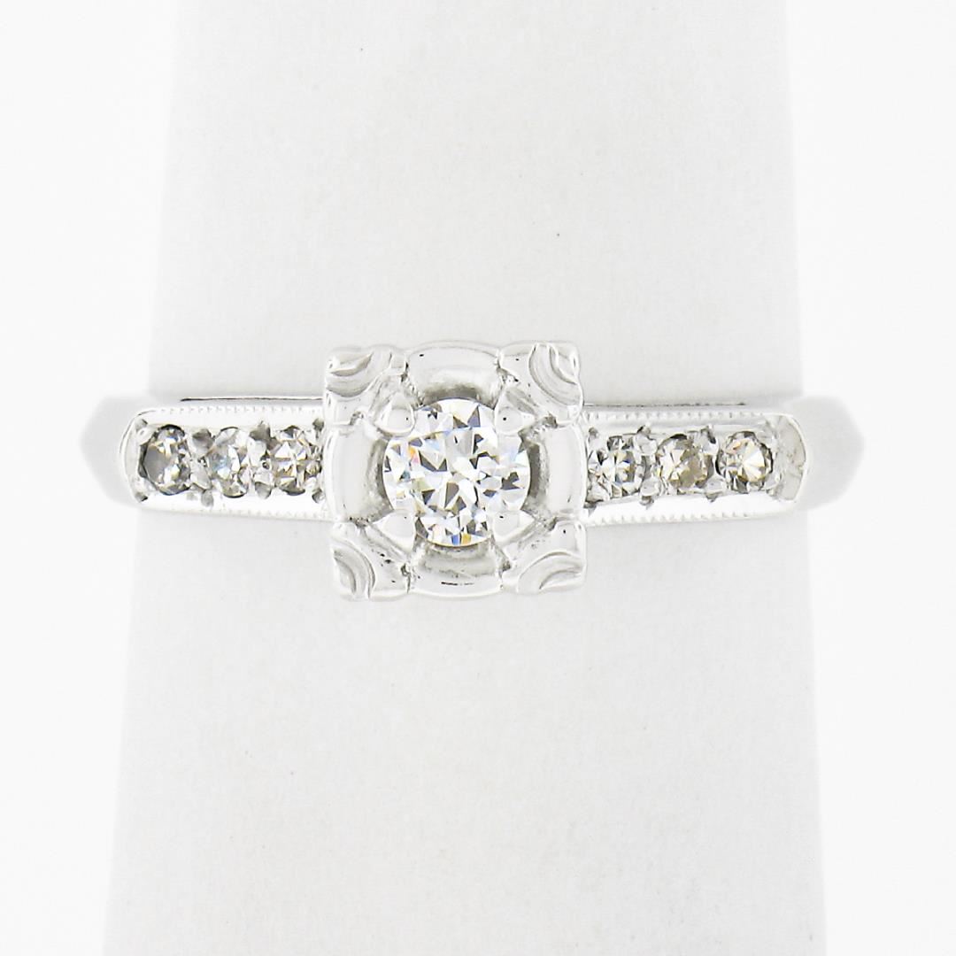A vintage solid 14k white gld engagement ring, with 1 old transitional cut natural diamond (F - VS1 ; 0.14ct), and 6 old single cut natural diamonds (F/G - VS1/VS2 ; 0.10ctw). The ring is size 4.5, weighs a total of 2.58 grams, and measures 5.80mm wide.