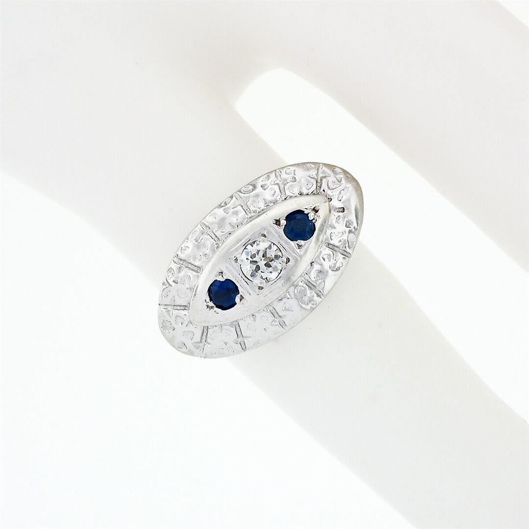 A vintage solid 14k white gold platter ring, with 1 old european cut natural diamond (H- VS2; 0.15ct), and 2 round cut natural sapphires (0.10ctw). The ring is size 5.0, weighs a total of 3.55 grams, and measures 10.50mm wide.