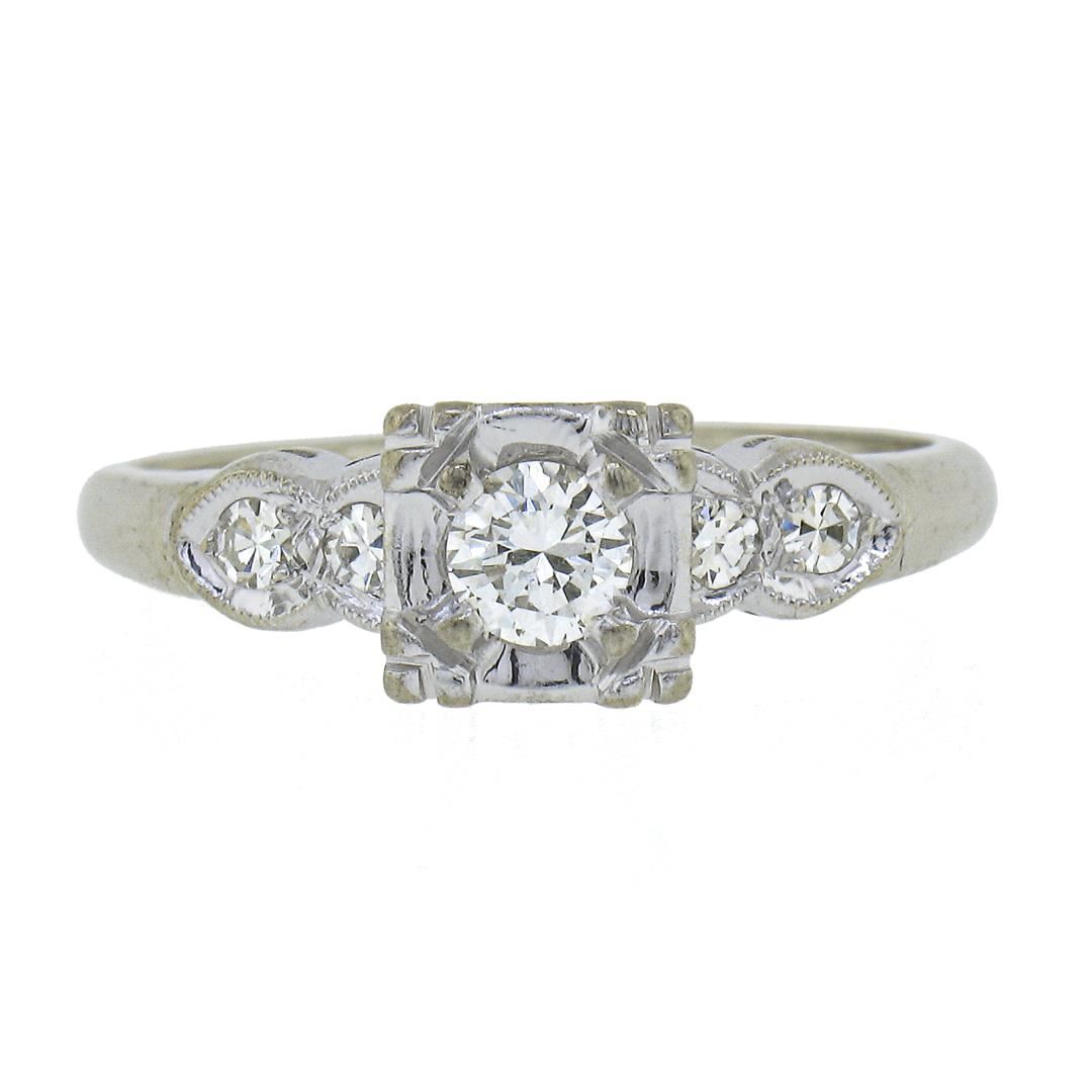 A vintage solid 14k white gold engagement ring, with 1 round cut natural diamond (F - VS1 ; 0.23ct), accented with 4 old single cut natural diamonds (E/F - VS1/VS2 ; 0.12ctw). The ring is size 8.0, weighs a total of 2.59 grams, and measures 6.5mm wide.