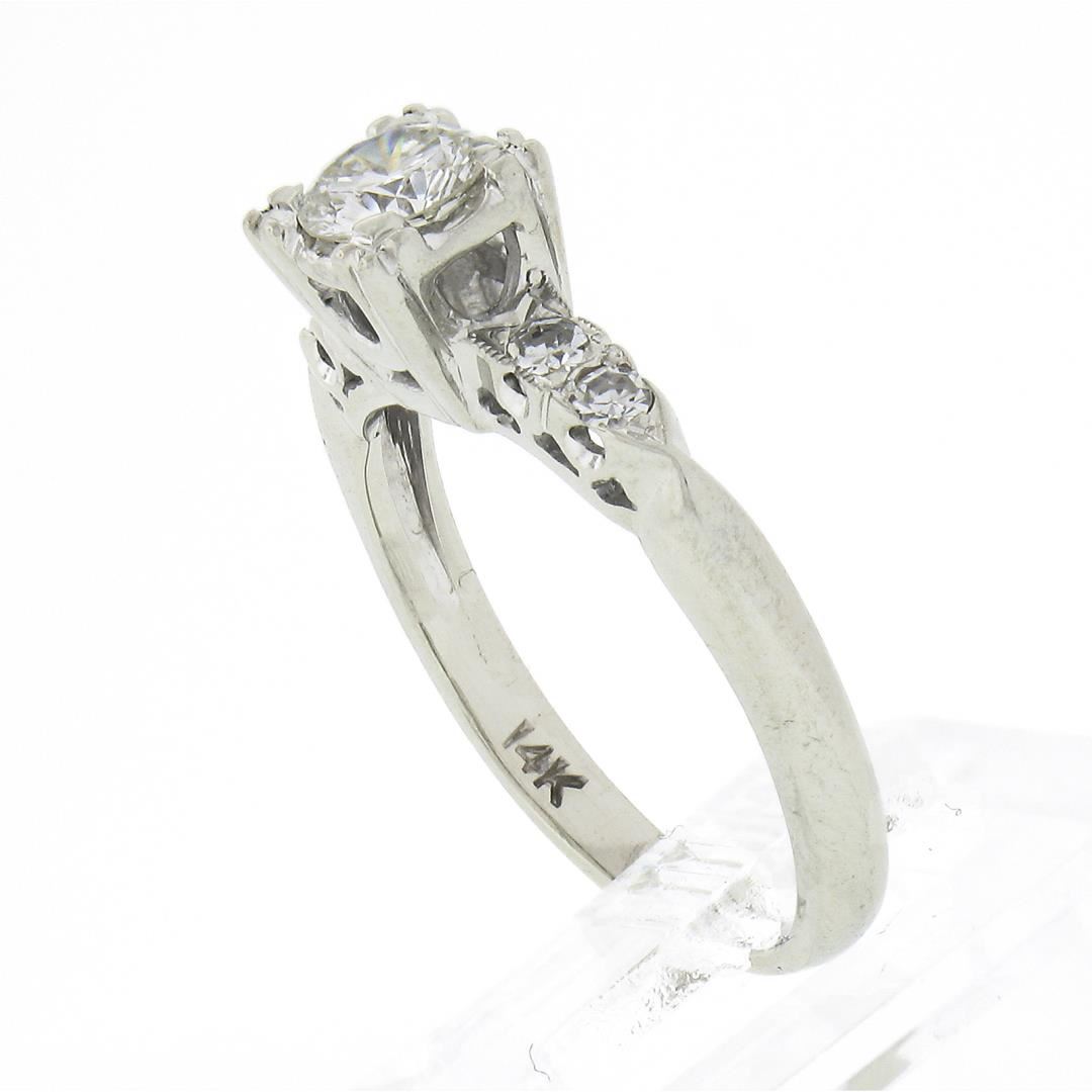A vintage solid 14k white gold engagement ring, with 1 round brilliant cut natural diamond (G - VS1 ; 0.36ct), accented with 4 old single cut natural diamonds ( F/G - VS1/VS2 ; 0.10ctw). The ring is size 4.0, weighs a total of 2.28 grams, and measures 5.4mm wide.
