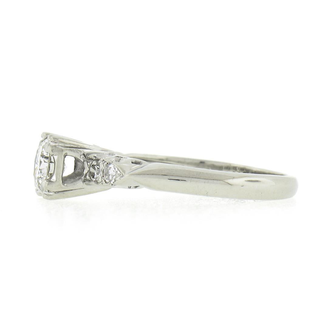 A vintage solid 14k white gold engagement ring, with 1 round brilliant cut natural diamond (G - VS1 ; 0.36ct), accented with 4 old single cut natural diamonds ( F/G - VS1/VS2 ; 0.10ctw). The ring is size 4.0, weighs a total of 2.28 grams, and measures 5.4mm wide.