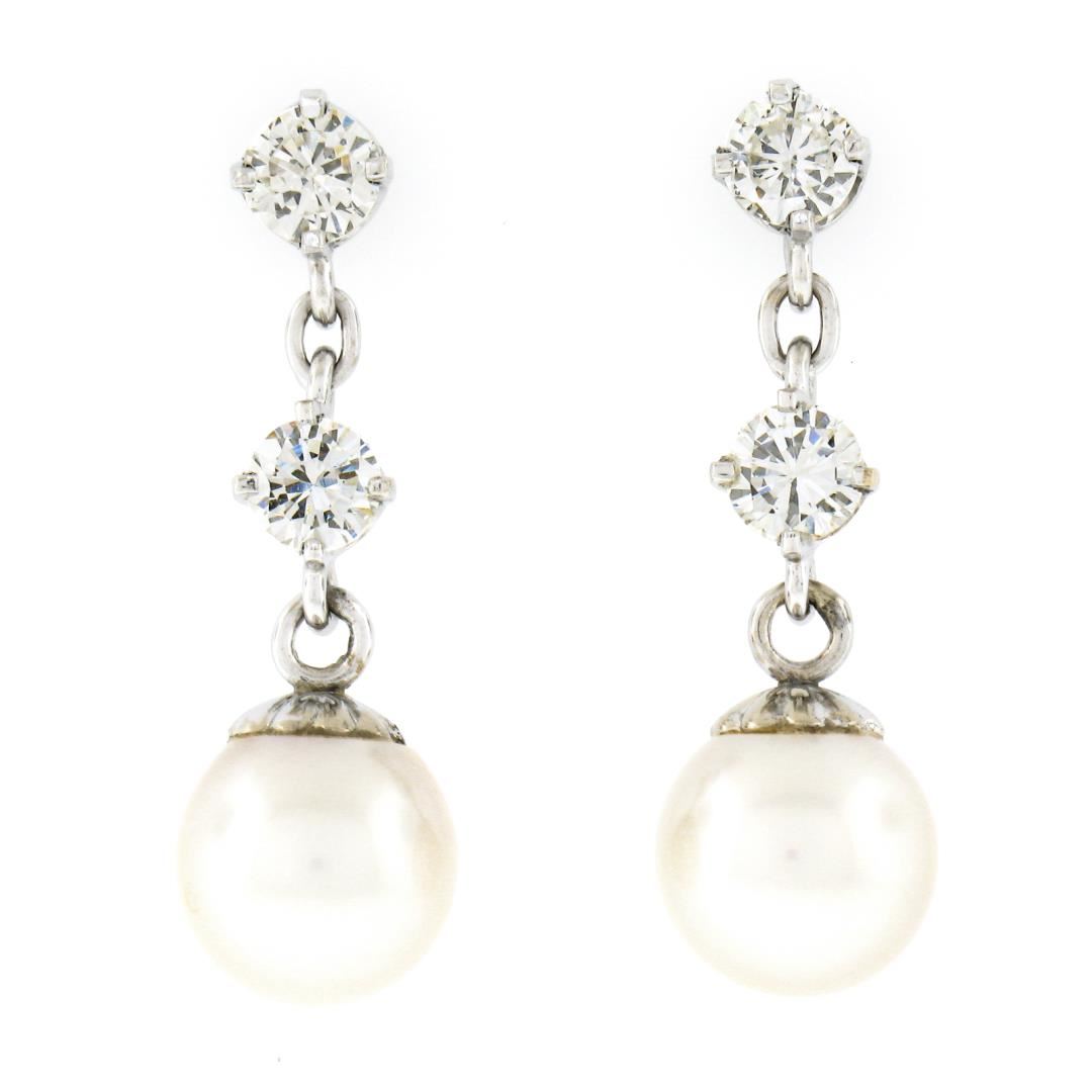 A vintage solid 14k white gold drop dangle earrings, featuring 4 round brilliant cut natural diamonds (H/I - VS1/VS2 ; 0.72ctw) and 2 rounds shape cultured pearls (7.5mm each). The earrings measure approximately 24.20x7.5mm and weigh a total of 2.83 grams.