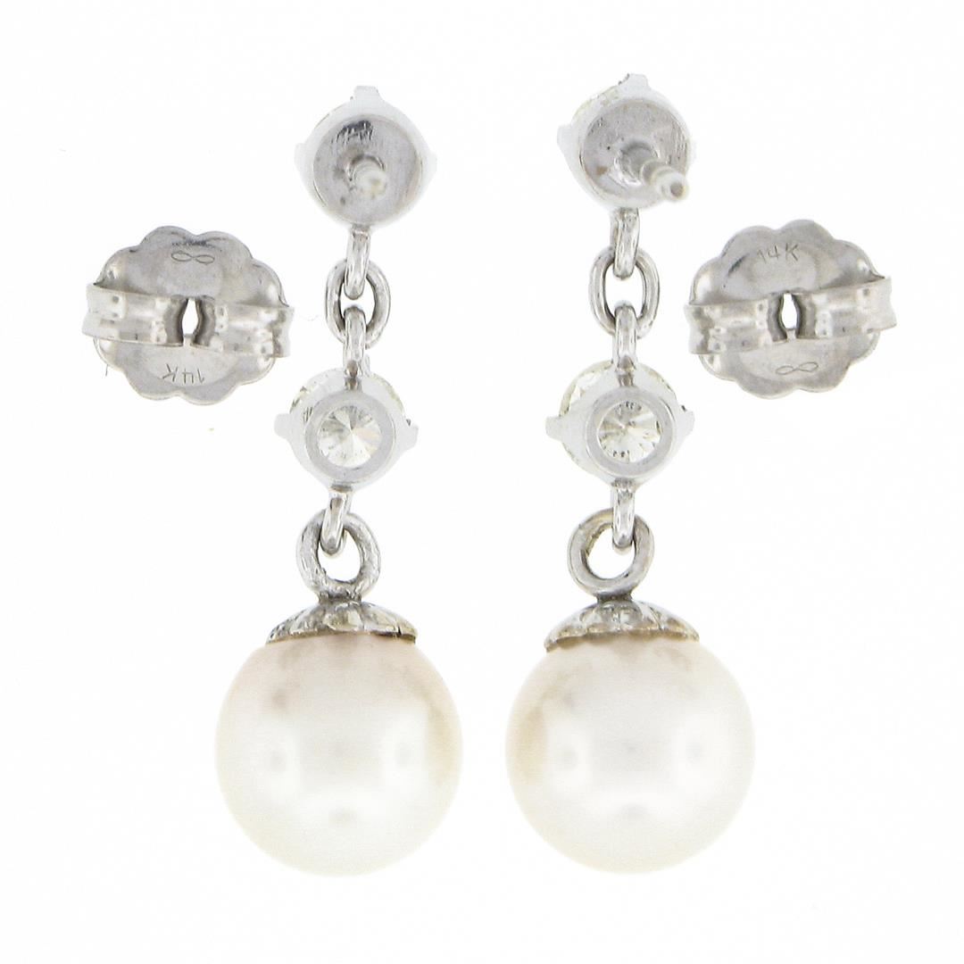 A vintage solid 14k white gold drop dangle earrings, featuring 4 round brilliant cut natural diamonds (H/I - VS1/VS2 ; 0.72ctw) and 2 rounds shape cultured pearls (7.5mm each). The earrings measure approximately 24.20x7.5mm and weigh a total of 2.83 grams.
