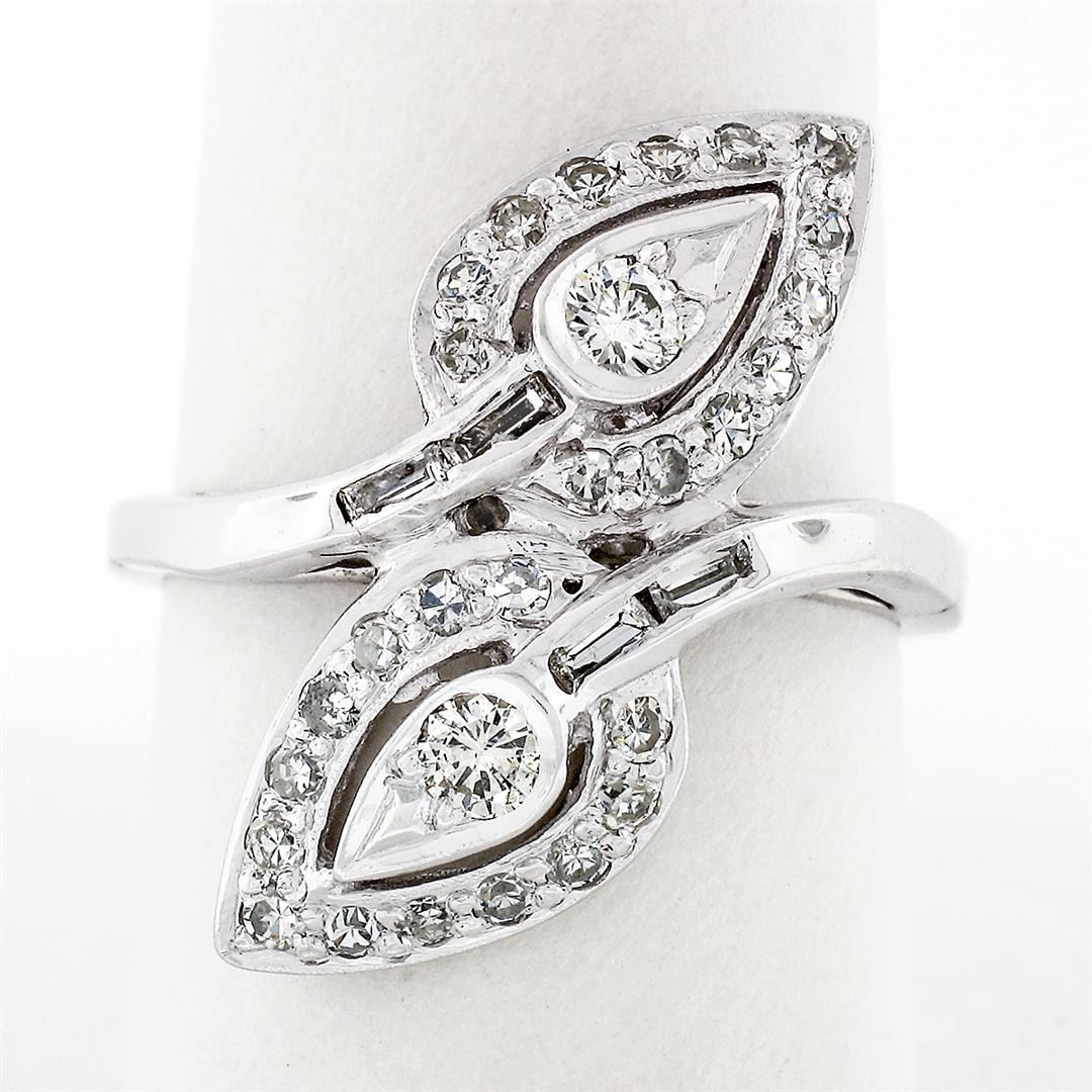 A solid 14k white gold leaf bypass ring, with 2 round transitional cut natural diamonds (G/H - VS2 ;- 0.18ctw), and 4 baguette cut natural diamonds (G/H - VS2 ; 0.16ctw), surrounded with 26 round single cut natural diamonds (G/H - VS2/SI1 ; 0.50ctw). The ring is size 9.5, weighs a total of 5.24 grams, and measures 22.75mm wide.