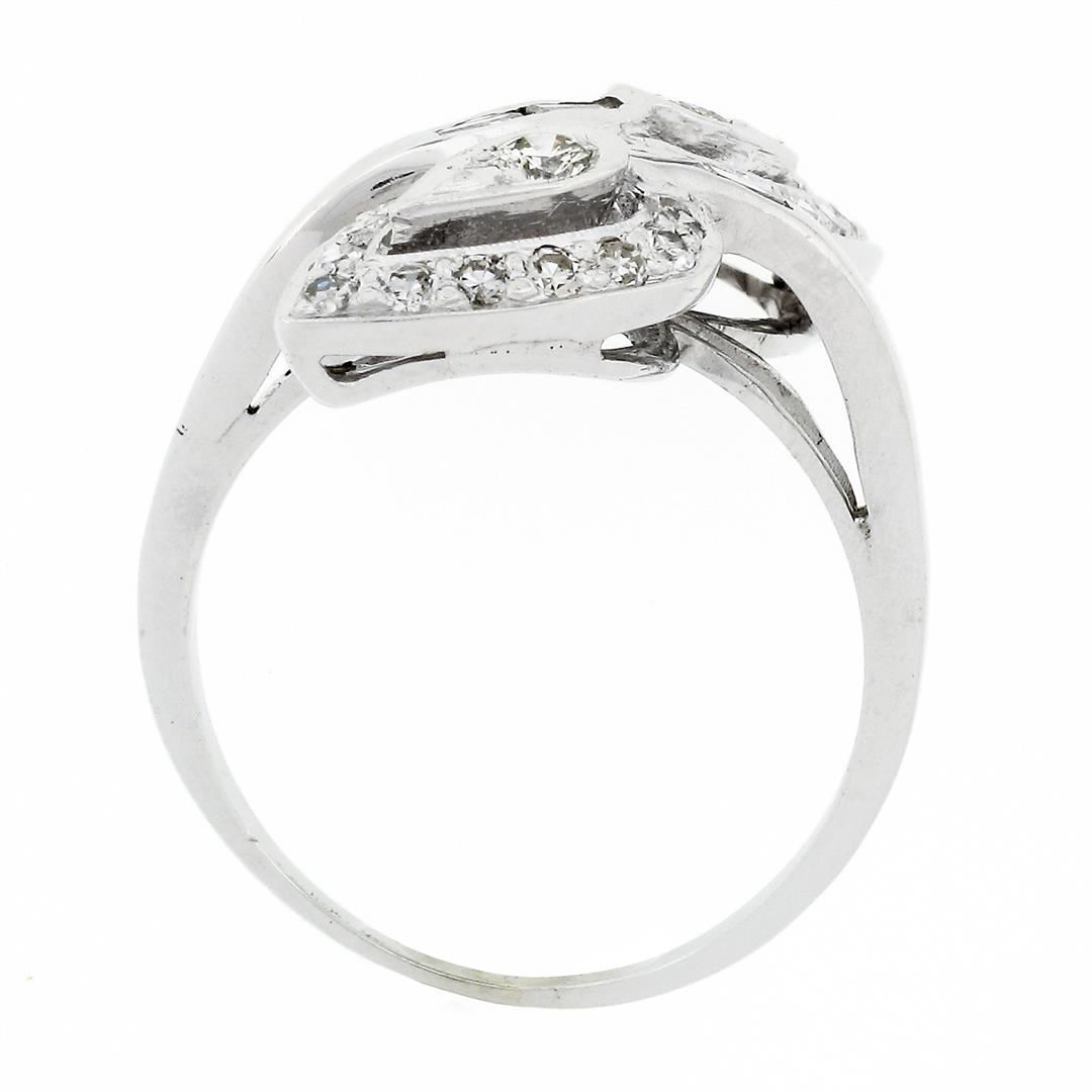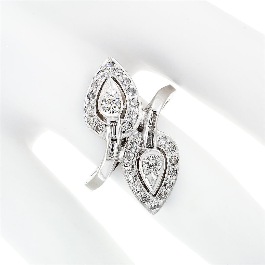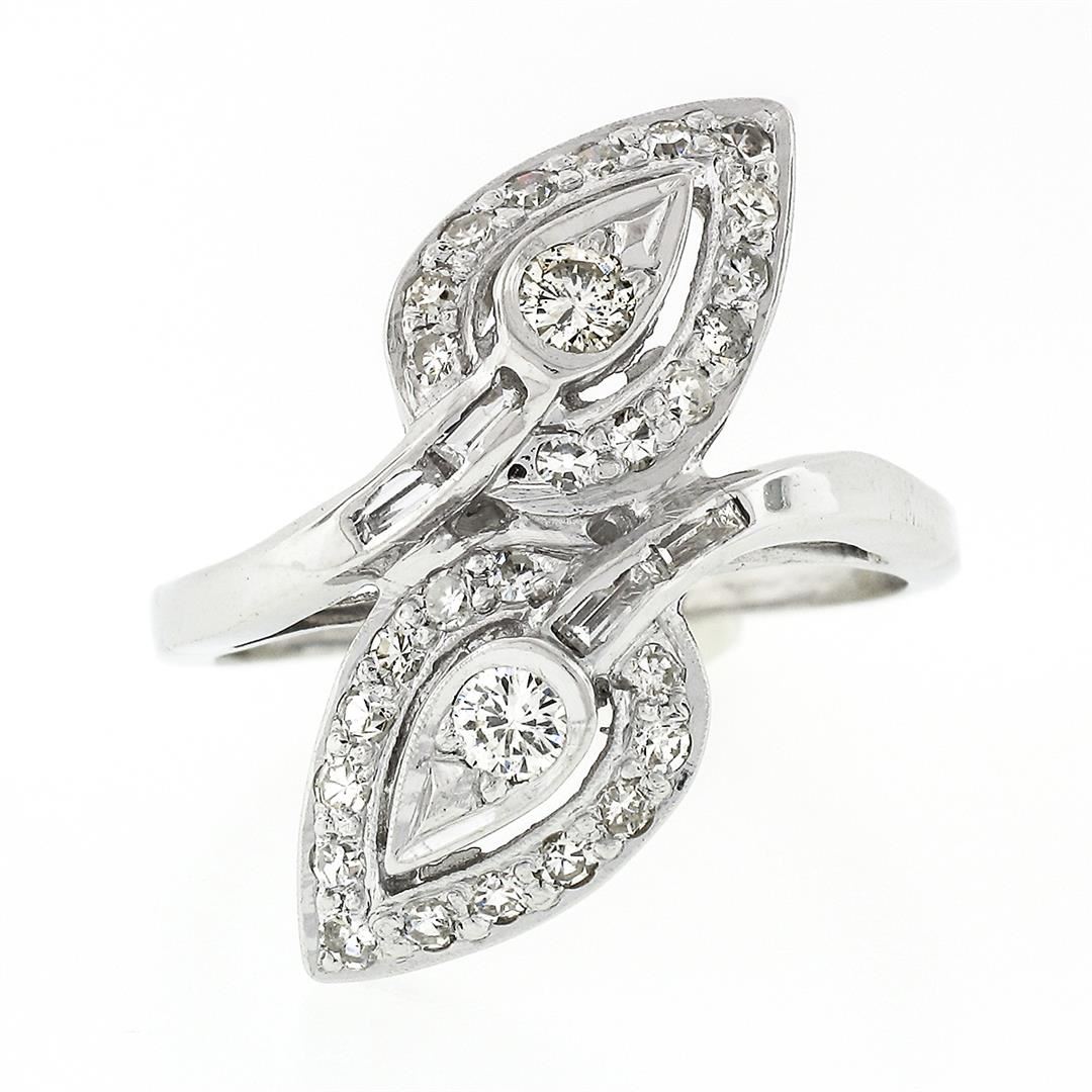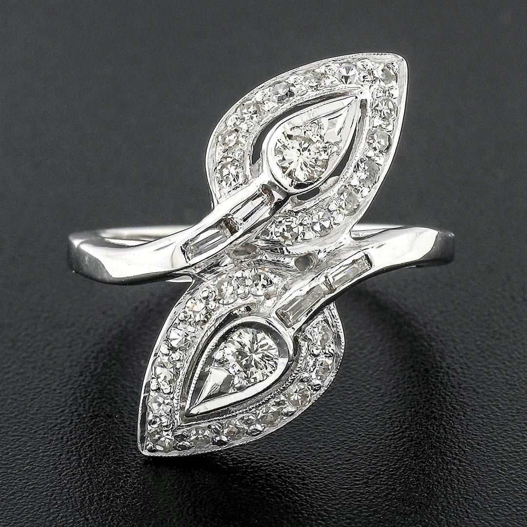 A solid 14k white gold leaf bypass ring, with 2 round transitional cut natural diamonds (G/H - VS2 ;- 0.18ctw), and 4 baguette cut natural diamonds (G/H - VS2 ; 0.16ctw), surrounded with 26 round single cut natural diamonds (G/H - VS2/SI1 ; 0.50ctw). The ring is size 9.5, weighs a total of 5.24 grams, and measures 22.75mm wide.