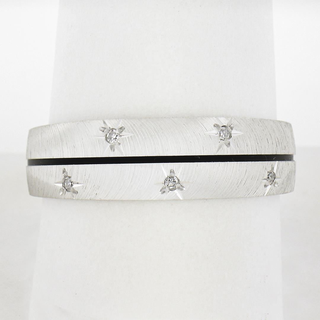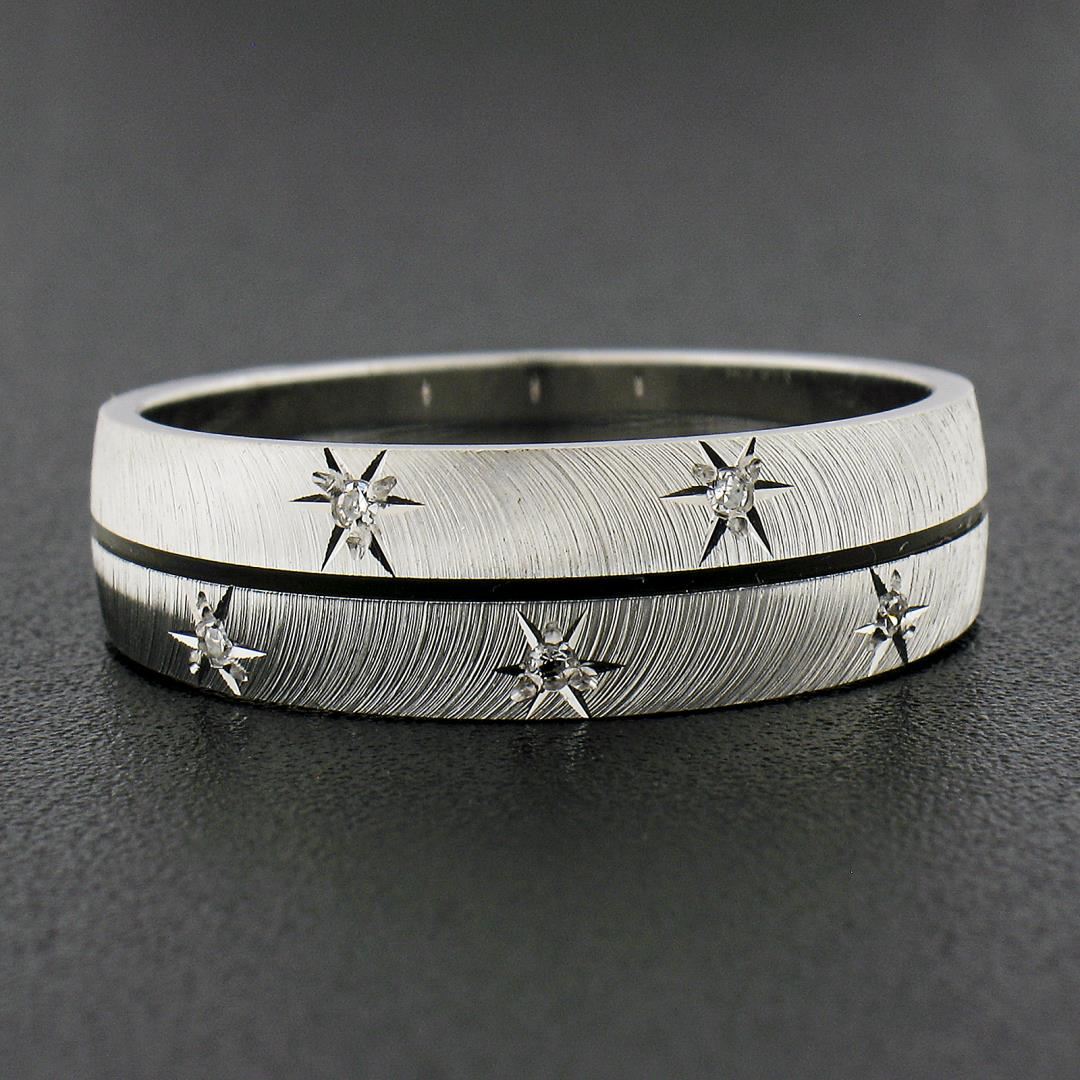 A vintage solid 14k white gold band ring, with 5 single cut natural diamonds (G/H - VS1/VS2 ; 0.08ctw). The ring is size 10.5, weighs a total of 5.65 grams, and measures 6.8mm wide.