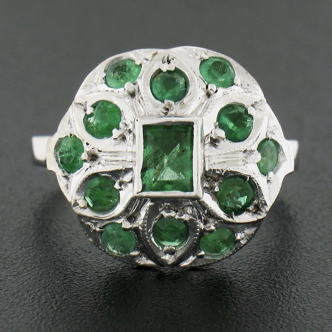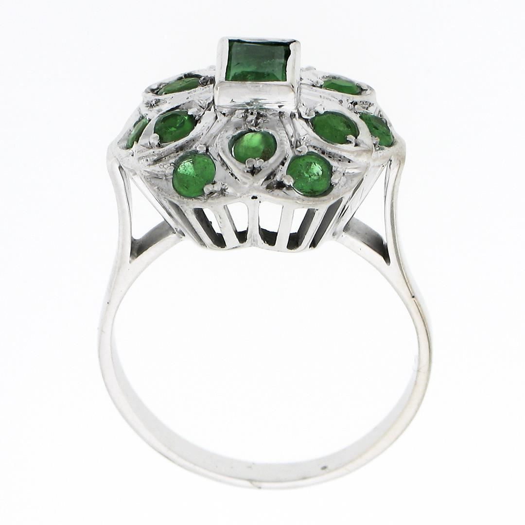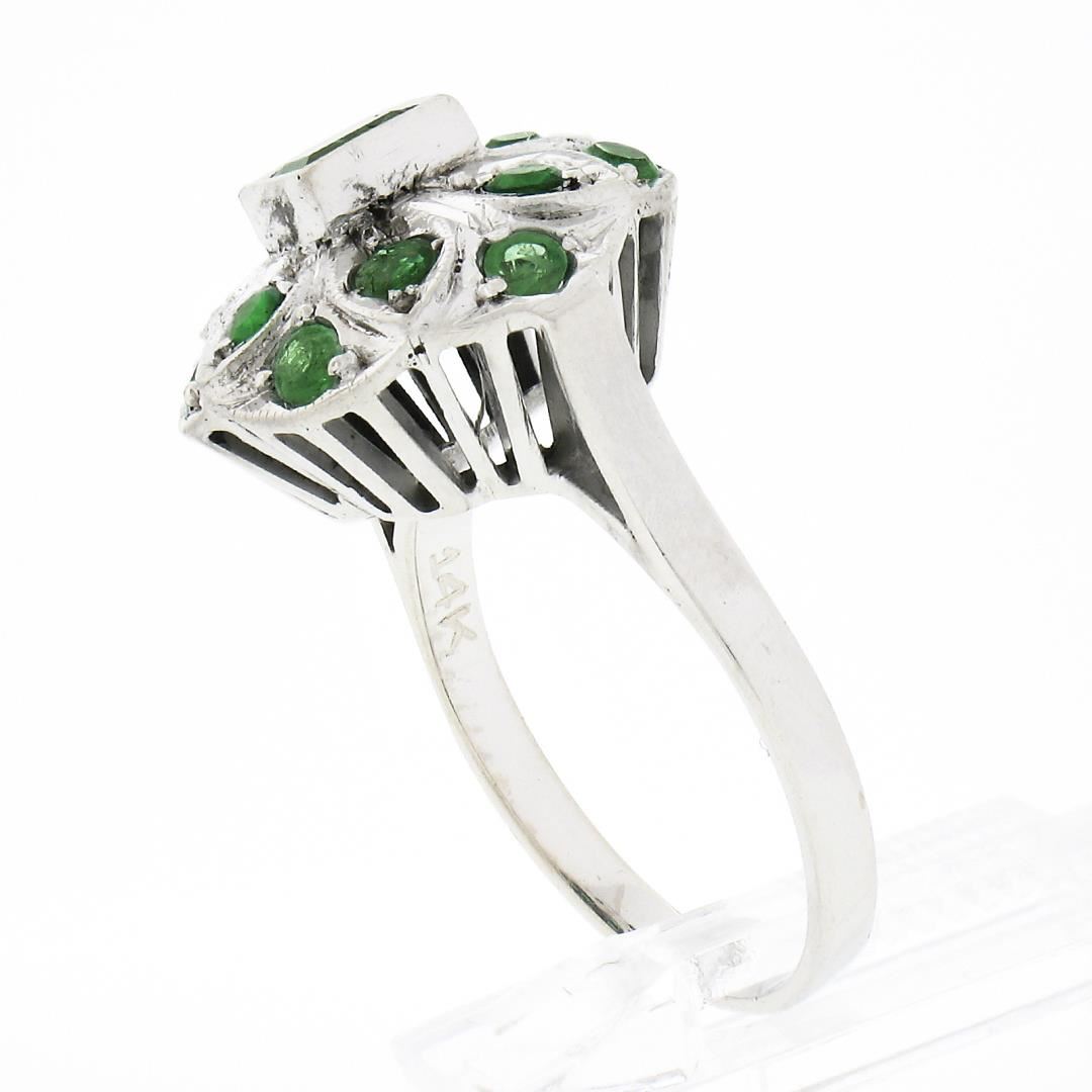 A vintage solid 14k white gold ring, with 12 round brilliant cut natural emeralds (0.70ctw), and 1 rectangular cut natural emerald (0.30ct). The ring is size 7.0, weighs a total of 3.93 grams, and measures 15.15mm wide.