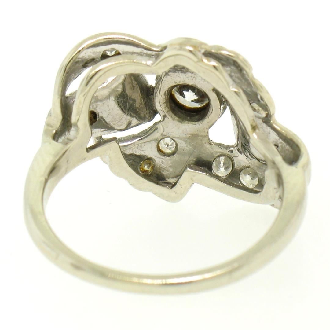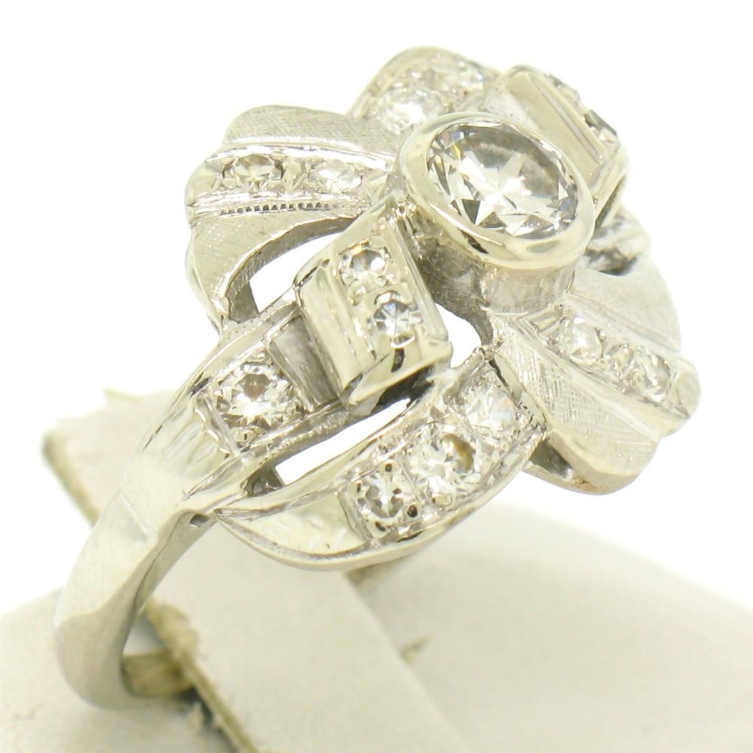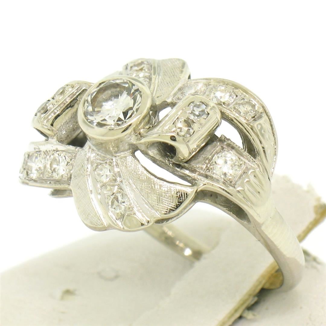 Vintage 14k White Gold 1.0ctw Round Brilliant & Single Cut Diamond Cocktail Ring. Please see photos and description for all available information. A vintage solid 14k whte gold cocktail ring, with 1 round brilliant cut natural diamond (G- VS1; 0.50ct), and 16 round brilliant cut natural diamonds (G/H - VS1/VS2; 0.50ctw). The ring is size 7.0, weighs a total of 5.2 grams, and measures 15.75mm wide.