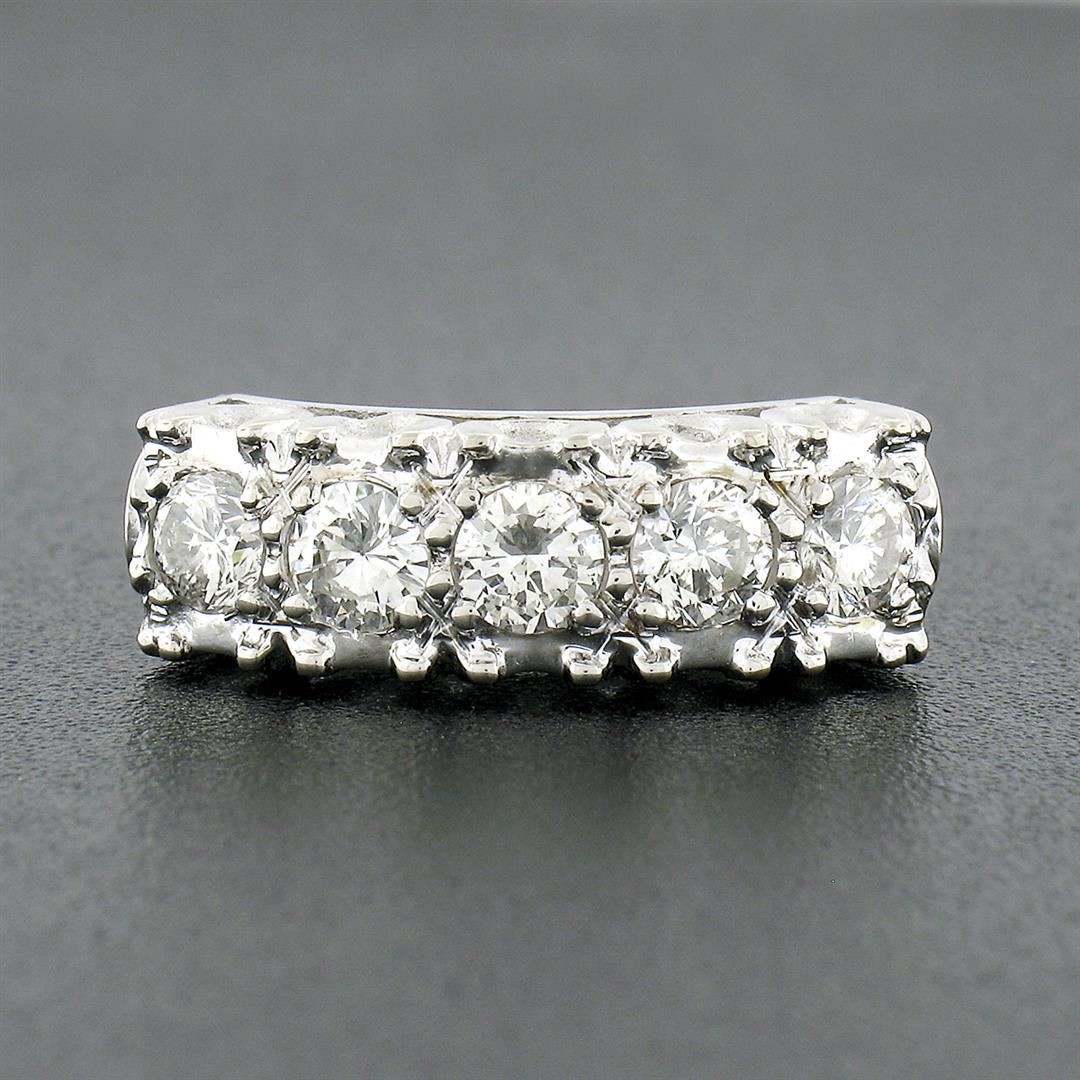 A solid 14k white gold wide band ring, with 5 round brilliant cut natural diamonds (G/H - SI1/SI2 ; 1.08ctw). The ring is size 6.0, weighs a total of 4.29 grams, and measures 6.50mm wide.