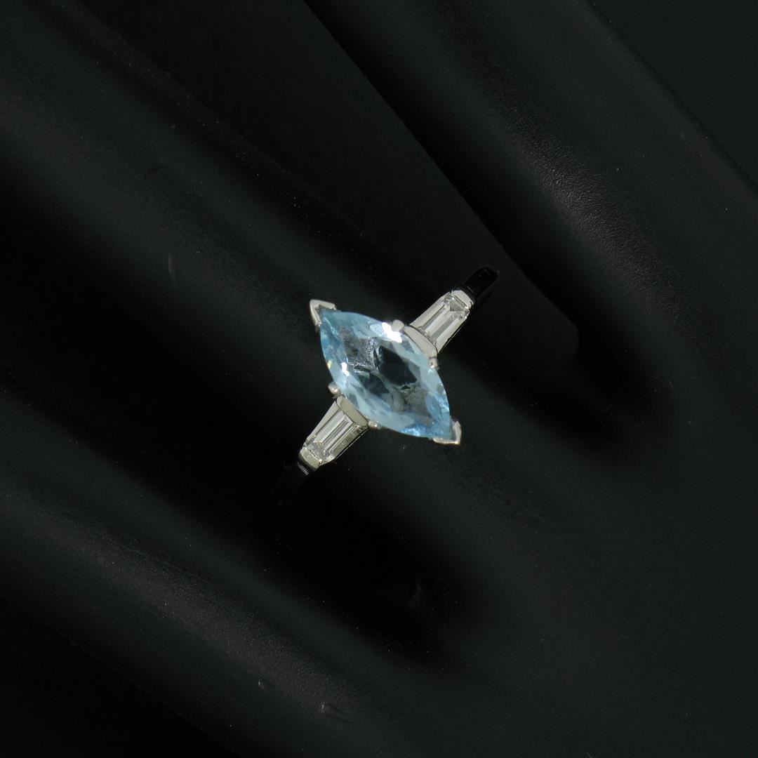 An excellent condition vintage 14k white gold ring prong set with a 0.85ct marquise cut aquamarine accented with 0.38ctw of baguette cut diamonds (E - VVS2). The ring is size 6.5, weighs a total of 2.56 grams, and measures 12.0mm wide.