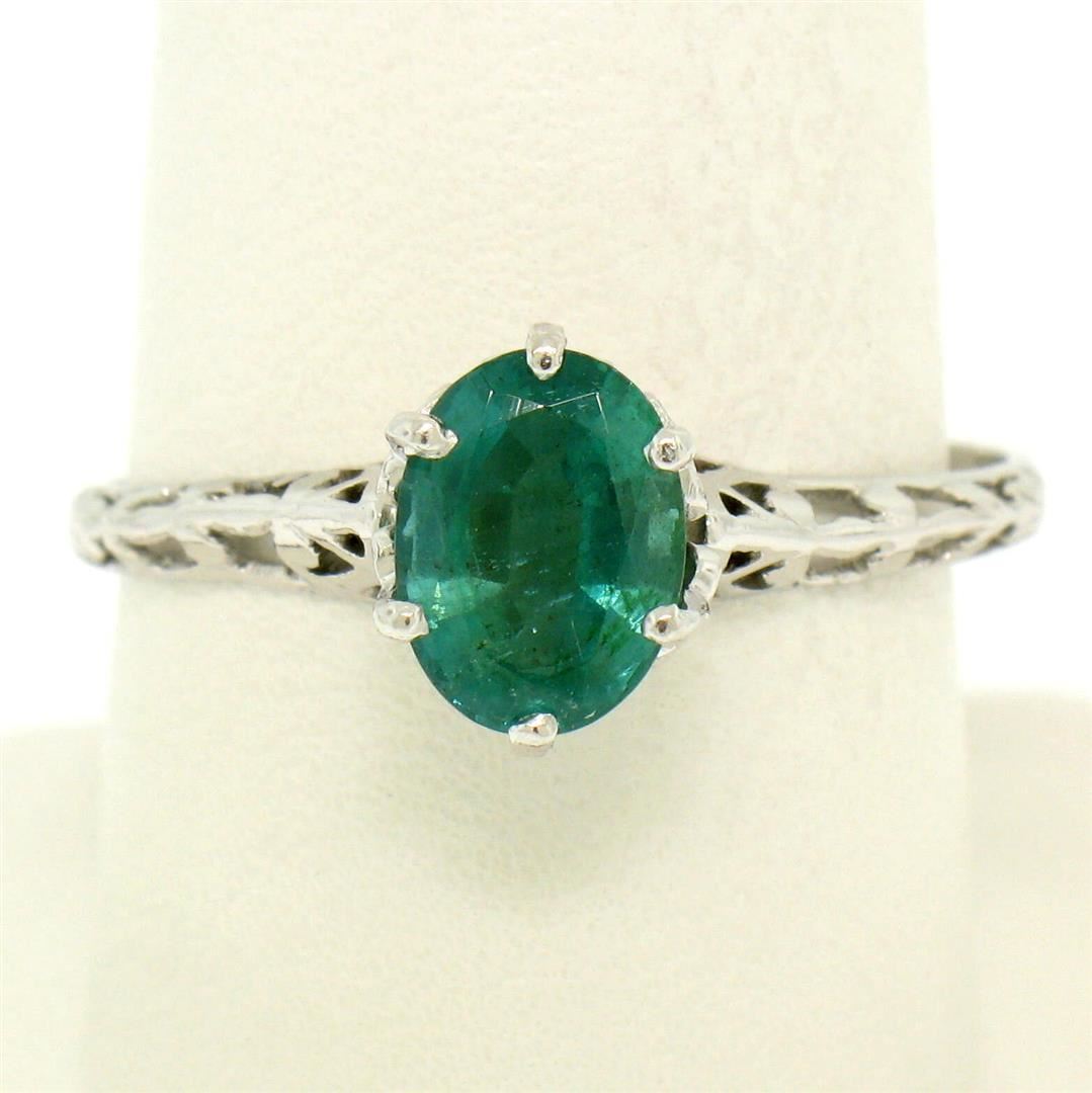 A vintage solid 14k white gold solitaire ring, with 1 oval cut natural emerald (1.38ct ). The ring is size 10.5, weighs a total of 3.1 grams, and measures 9.15mm wide.