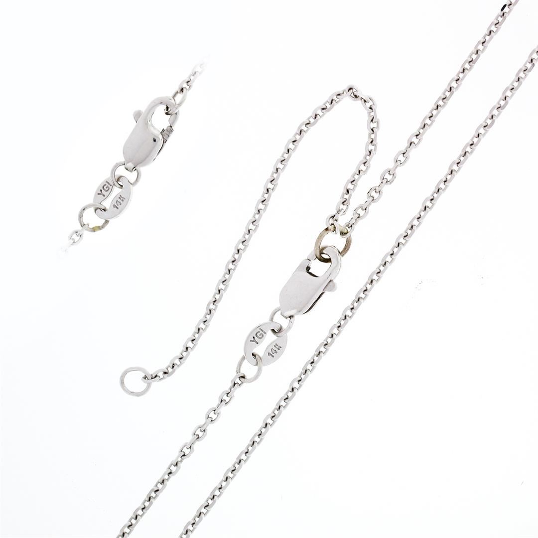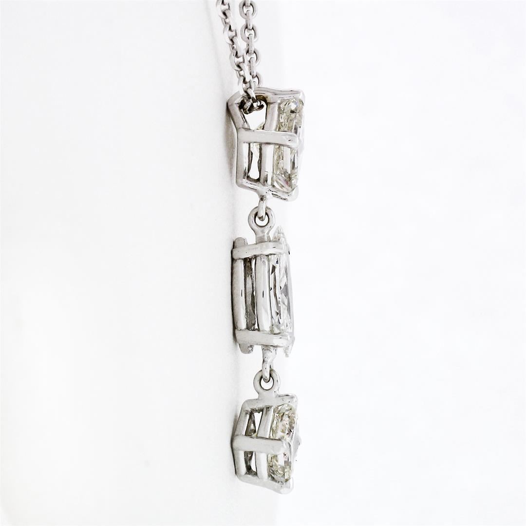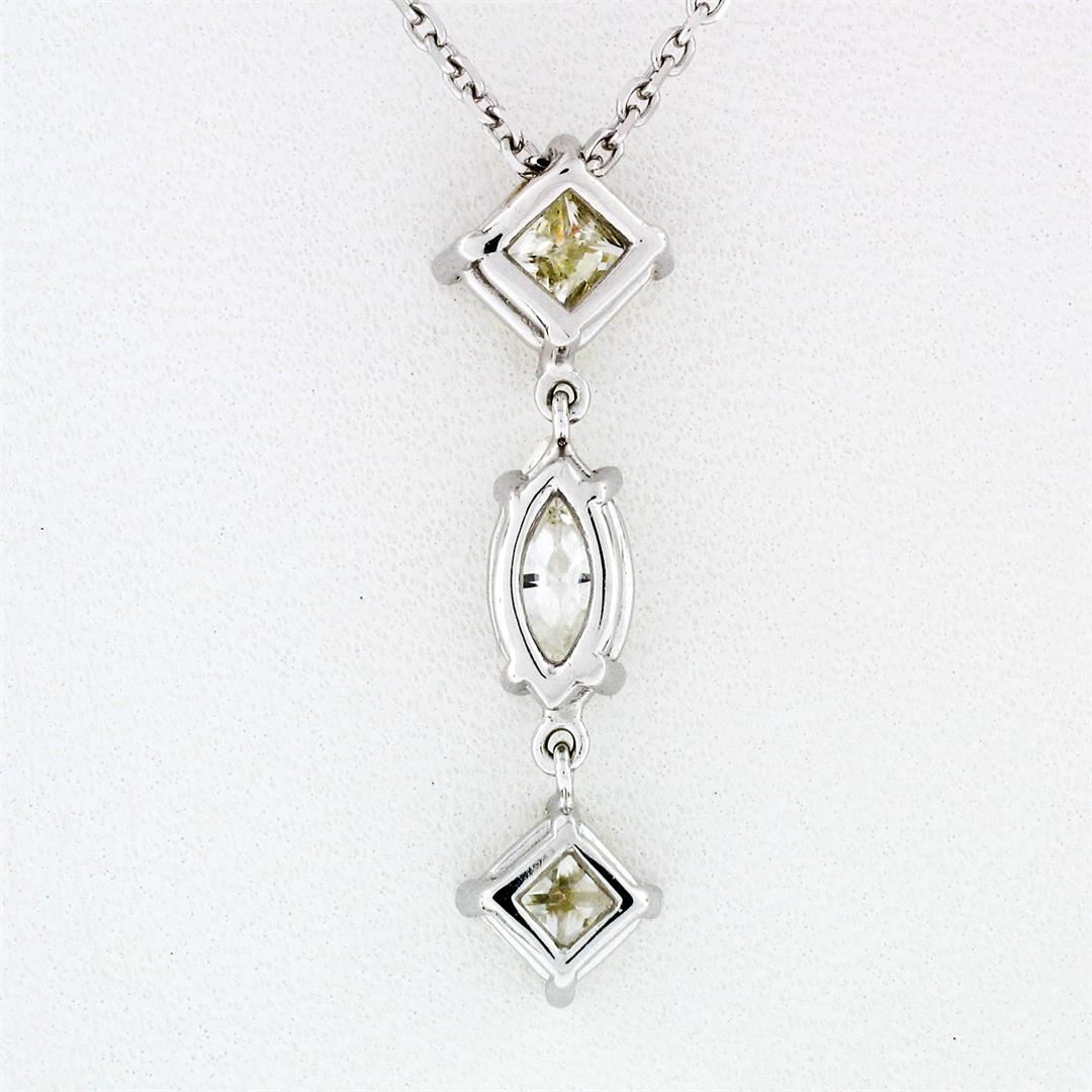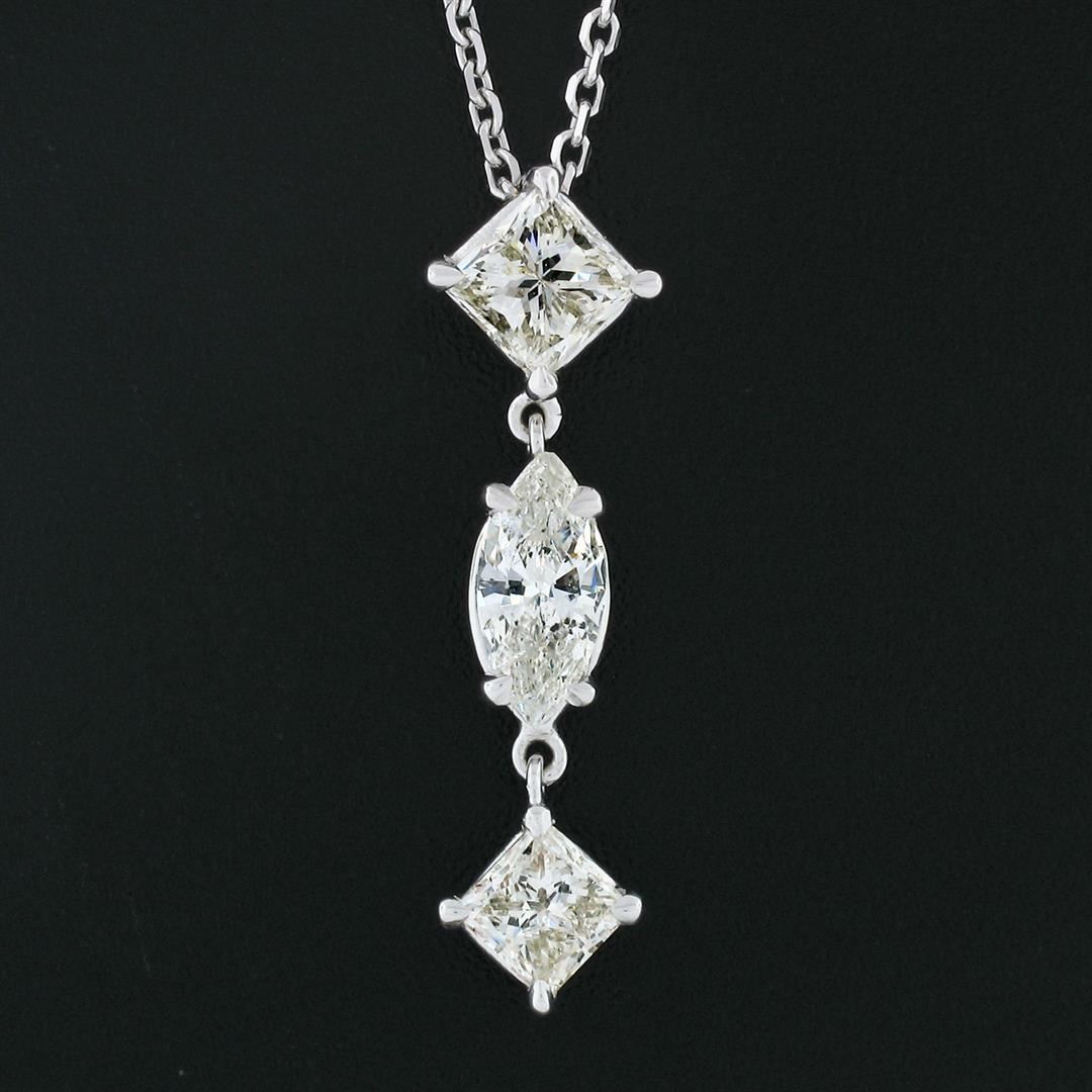 A vintage 14k white gold drop dangle pendant necklace, with 1 princess cut natural diamond (H - VS2; 0.70ct), and 1 marquise cut natural diamond (H - VS2; 0.48ct), with 1 princess cut natural diamond (I - SI1; 0.45ct). 18 inch Fine Cable link chain, 3.55 grams total weight, pendant measures 26.50x7.50mm.