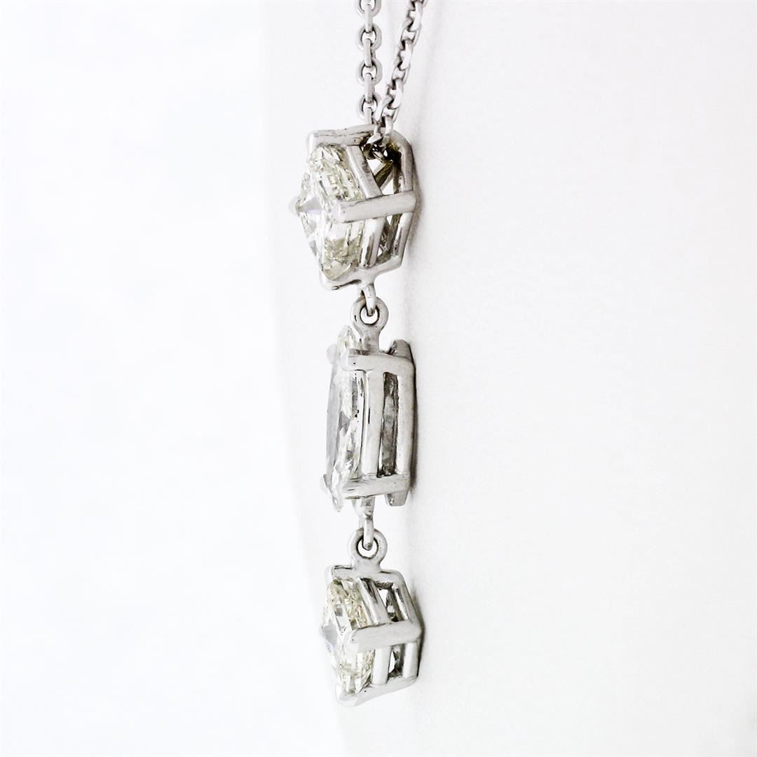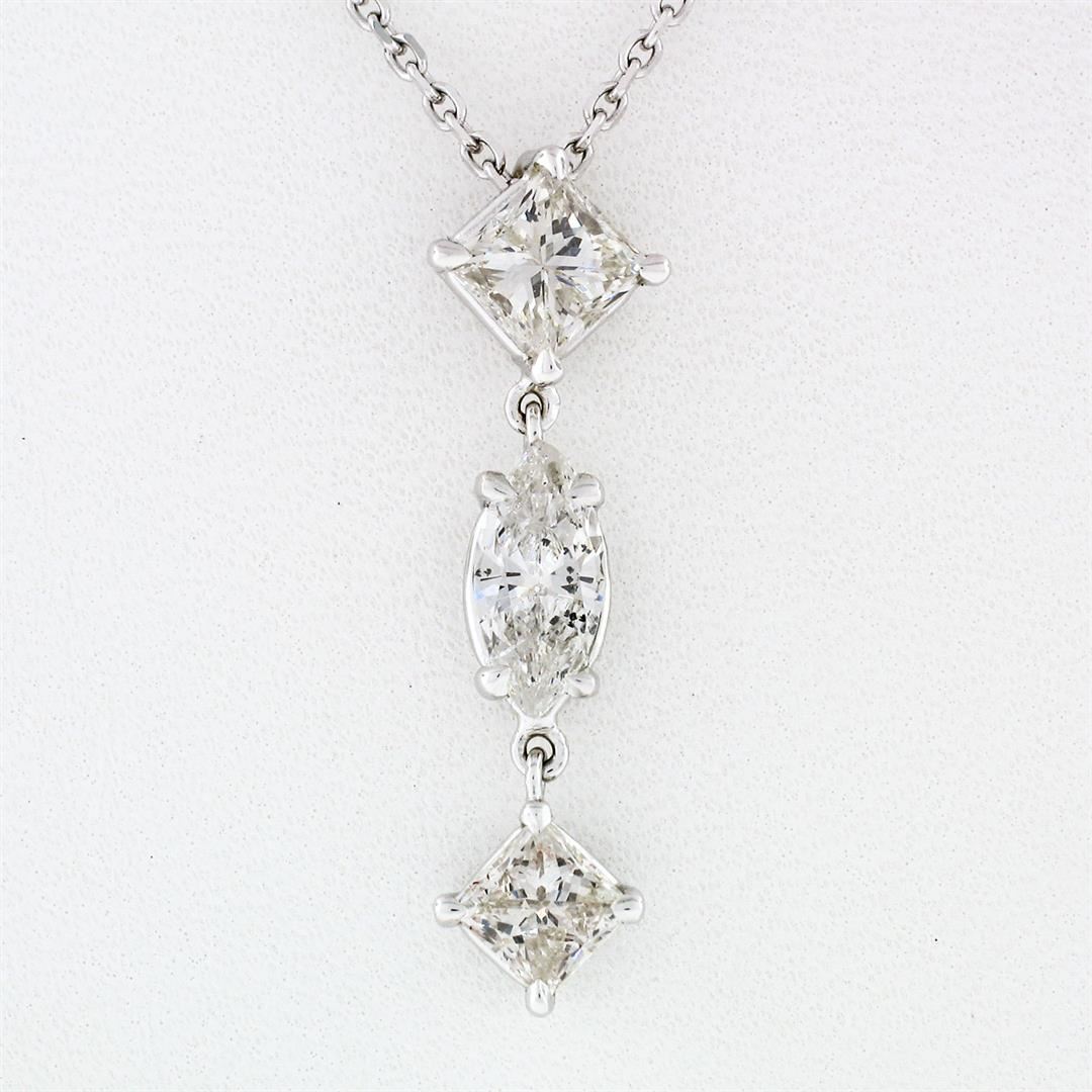 A vintage 14k white gold drop dangle pendant necklace, with 1 princess cut natural diamond (H - VS2; 0.70ct), and 1 marquise cut natural diamond (H - VS2; 0.48ct), with 1 princess cut natural diamond (I - SI1; 0.45ct). 18 inch Fine Cable link chain, 3.55 grams total weight, pendant measures 26.50x7.50mm.