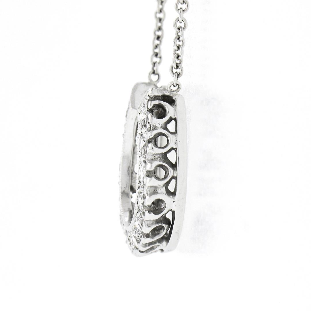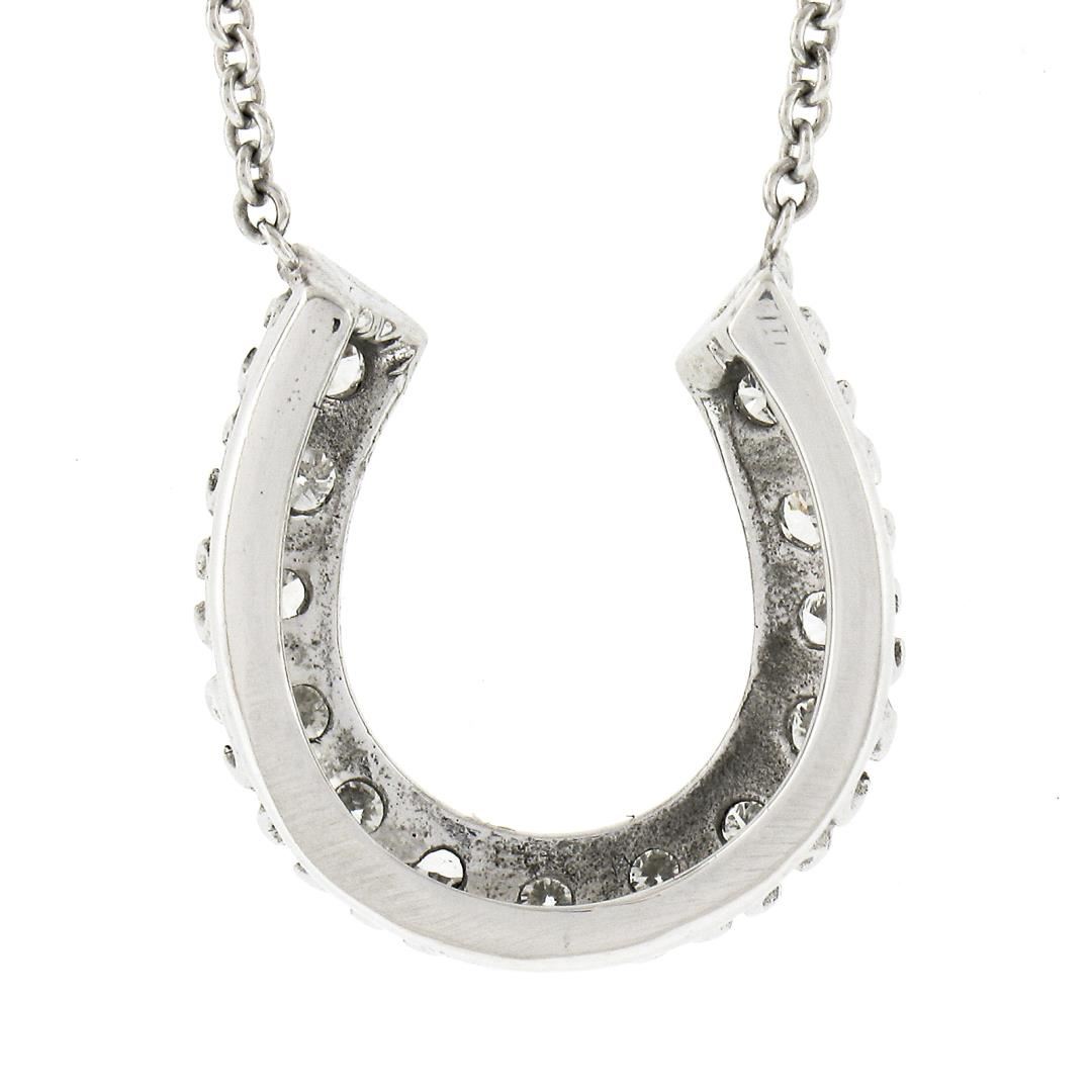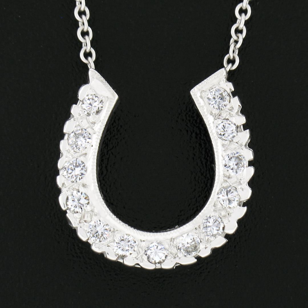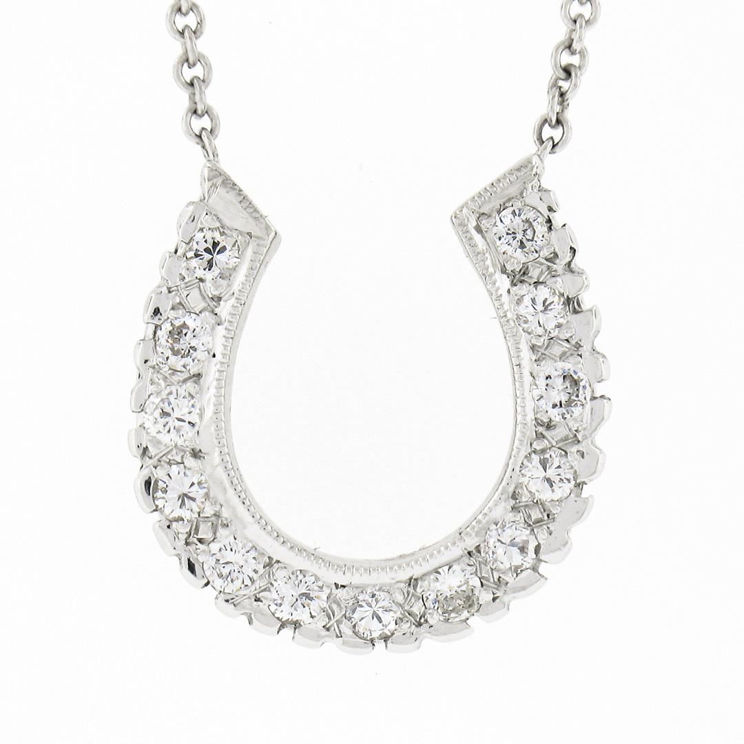 a vinatge solid 14k white gold lucky horseshoe pendant necklace, with 13 round brilliant cut natural diamonds (G/H - VS2 ; 0.39ctw). Adjustable 16.5 and 18.5 inch cable link chain, 4.29 grams total weight, pendant measures 15.90x15.40mm