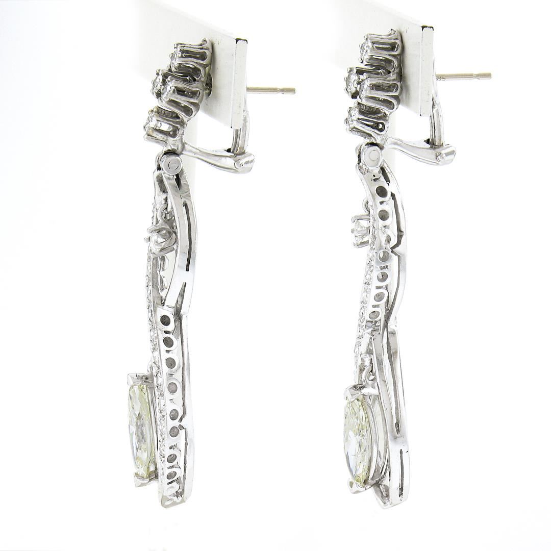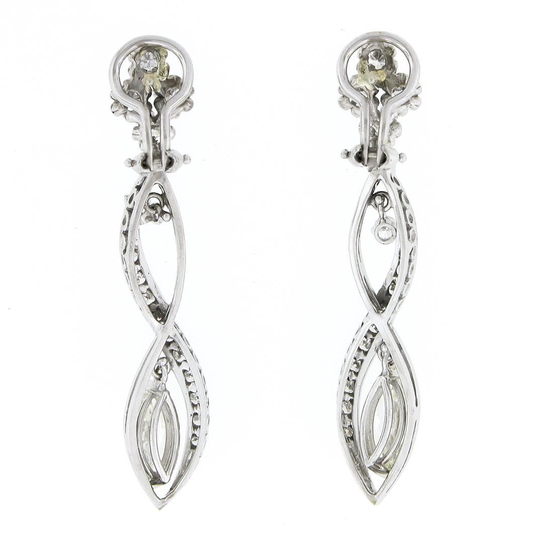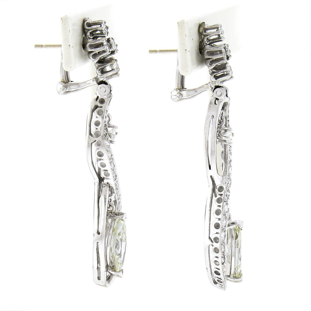 A vintage 14k white gold dangle earrings, featuring 2 marquise cut natural diamonds (K/L - SI1/SI2 ; 2.60ctw), and 32 old single & round brilliant cut natural diamonds (G/H - VS1/VS2 ; 1.40ctw). The earrings measure approximately 51.50x9.60mm and weigh a total of 9.91 grams.