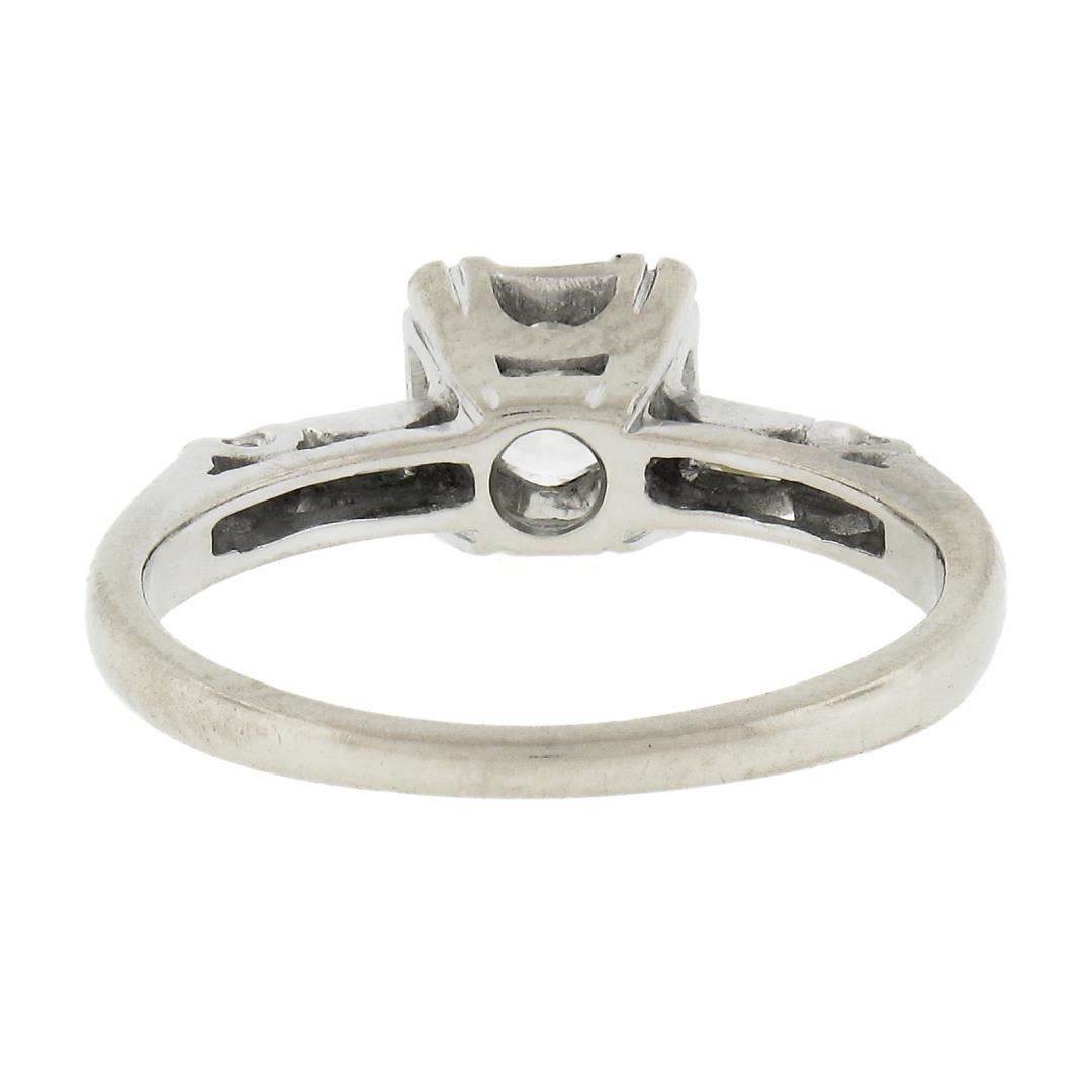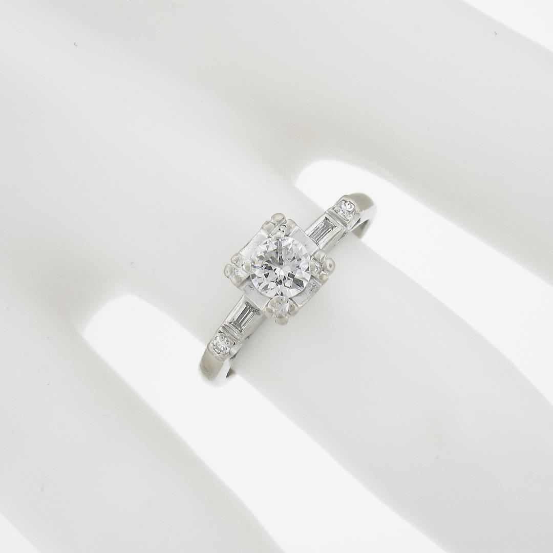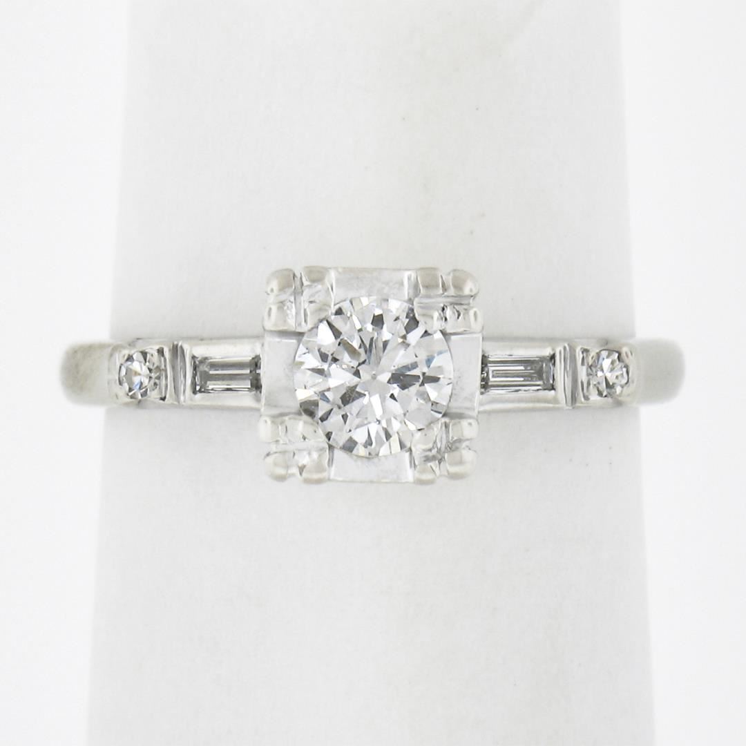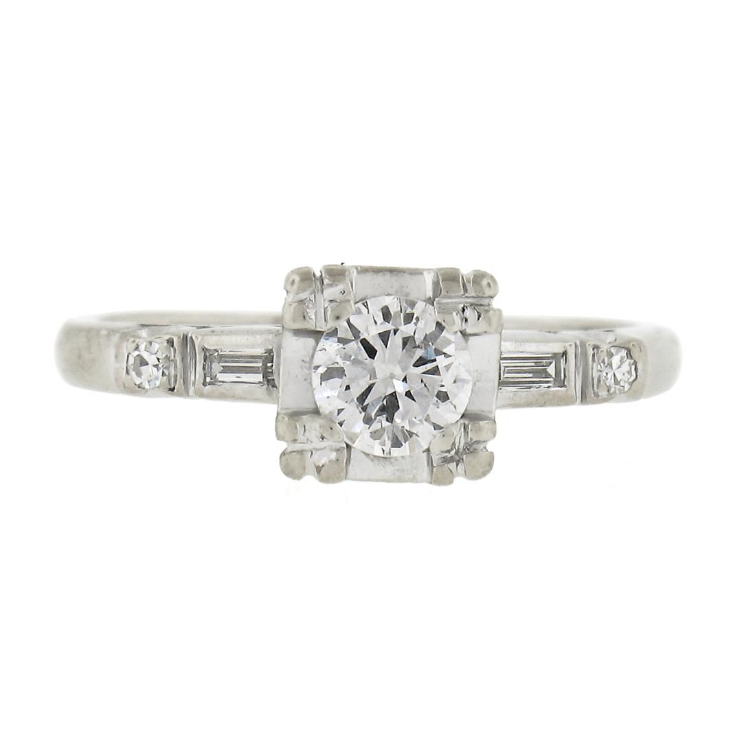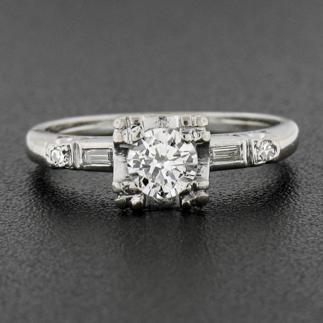 A vintage solid 14k white gold engagement ring, with 1 old transitional cut natural diamond (G - SI1 ; 0.37ct), and 2 baguette cut with 2 single cut natural diamonds (G/H - VS2 ; 0.08ctw). The ring is size 5.5, weighs a total of 2.35 grams, and measures 6.3mm wide.