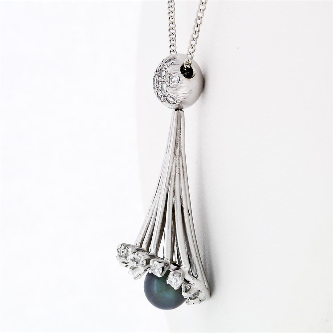 A vintage solid 14k white gold bell pendant with 1 round shaped fine black tahitian pearl (6.64mm) and 30 round single cut natural diamonds (G/H - VS1/VS2; 1.05ctw). The pendant weighs a total of 7.33 grams, measures 35.54x20.80mm including the bail, with 15 inch fine curb link chain.