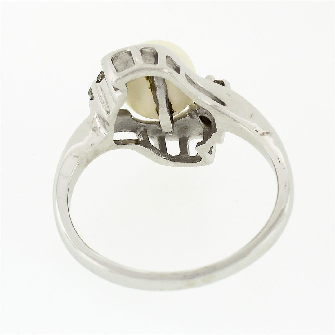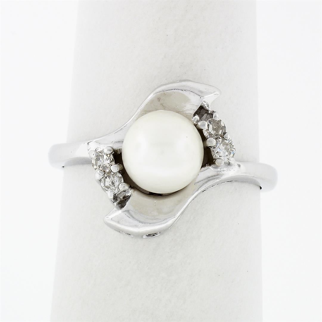 A vintage solid 14k white gold solitaire ring, featuring 1 round shape natural cultured pearl (6.7mm), accented with 4 old single cut natural diamonds (G/H- VS2/SI1; 0.12ctw). The ring is size 6.0, weighs a total of 3.39 grams, and measures 13.9mm wide.