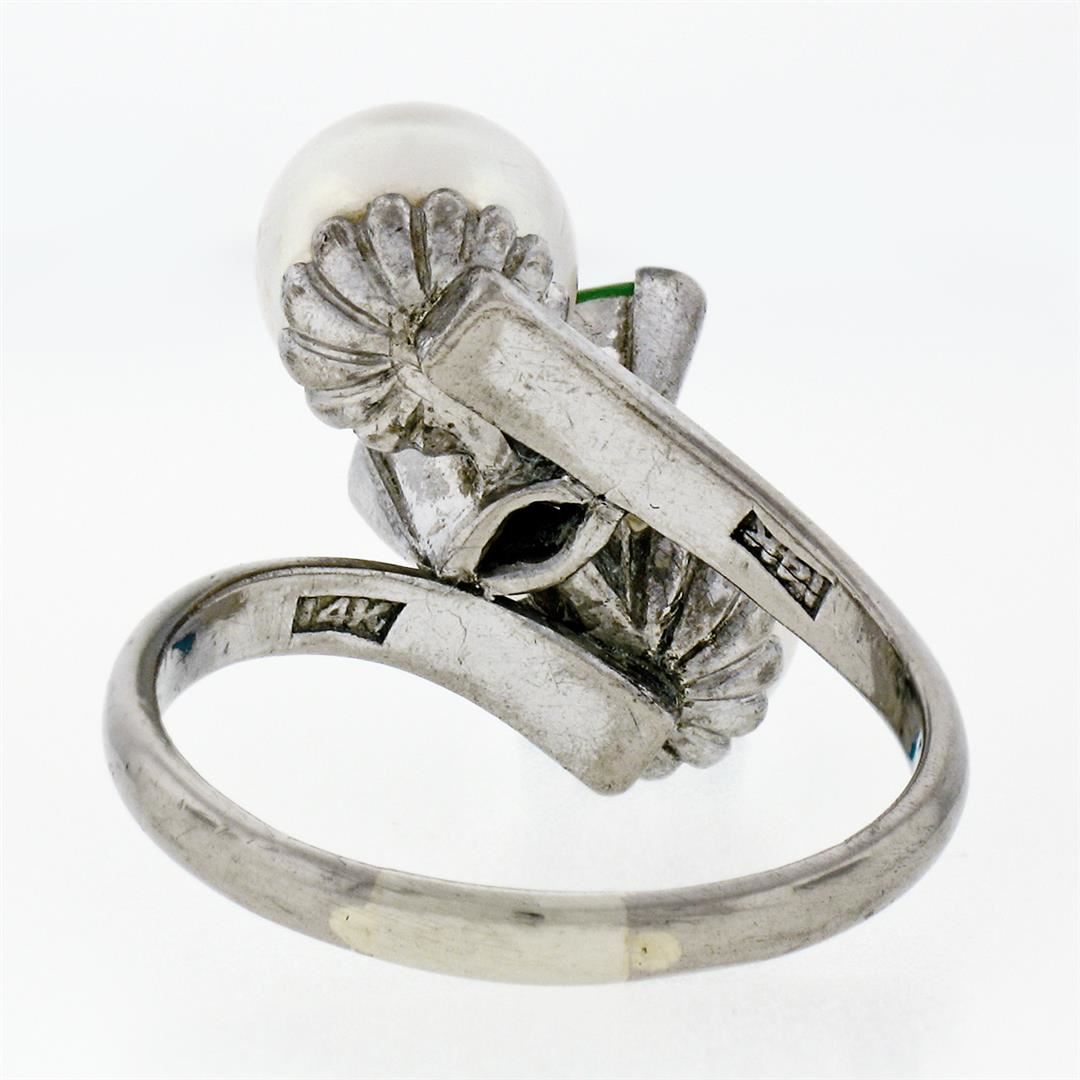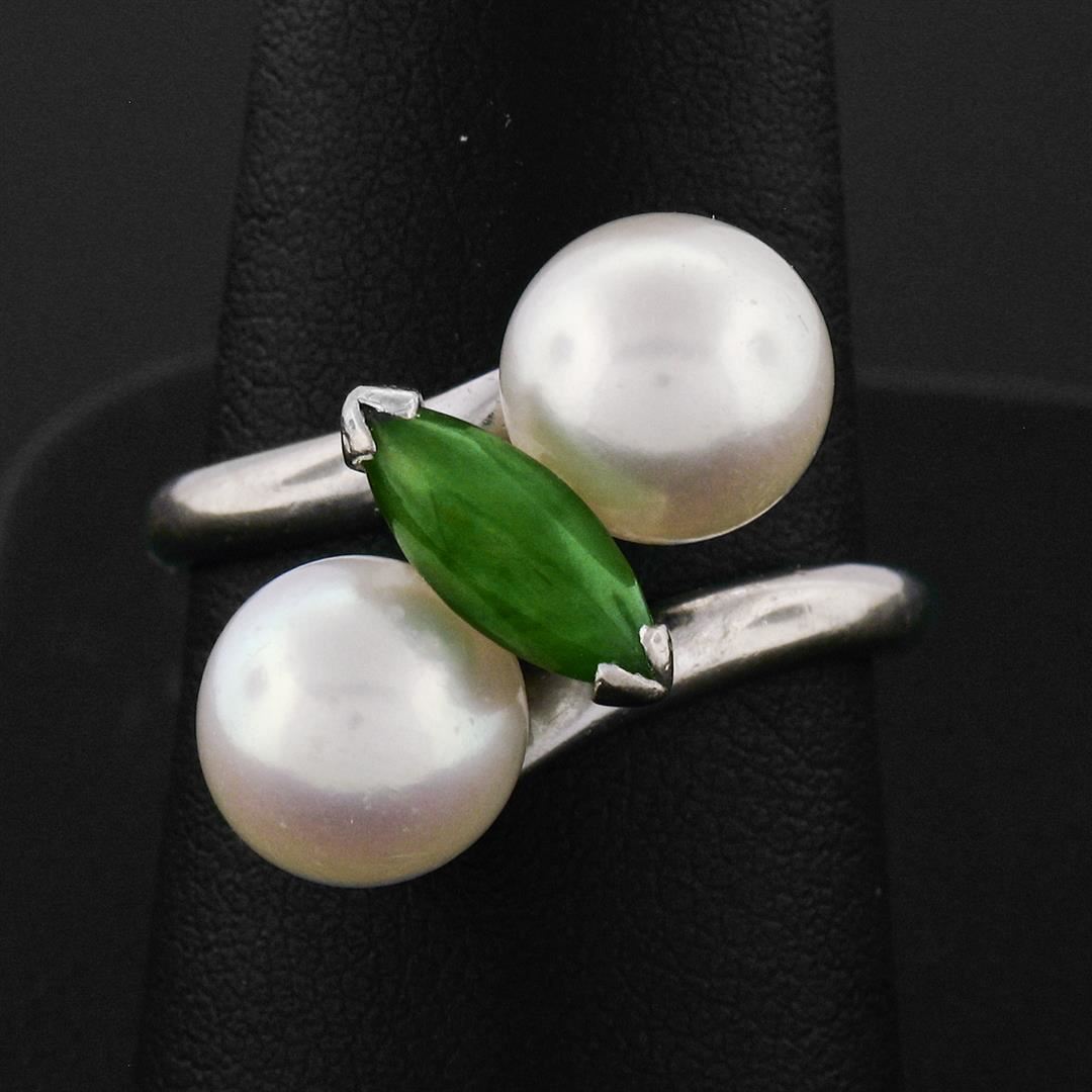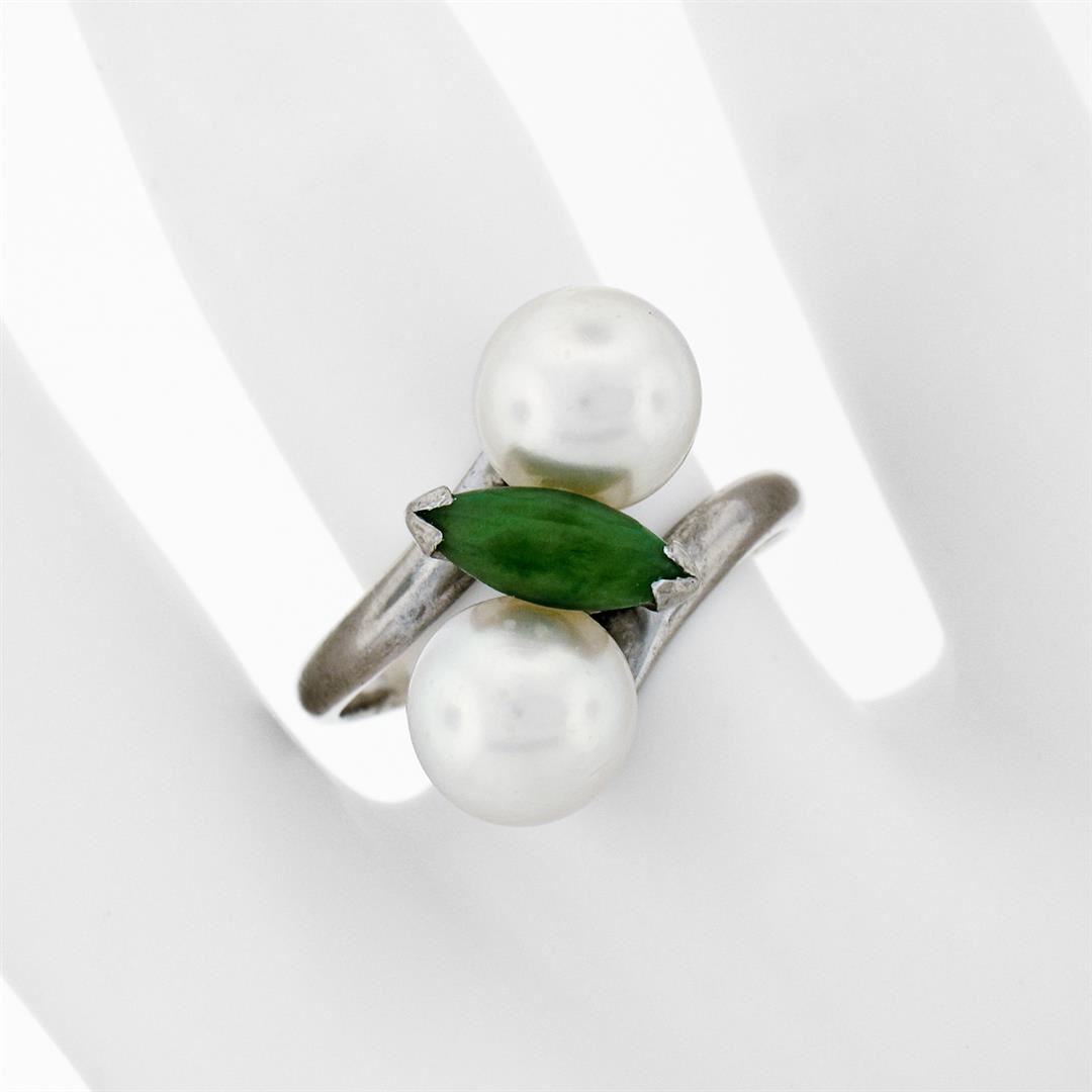 A vintage 14k white gold bypass ring featuring a marquise cabochon cut jade (10.25x4.00mm) set between 2 round cultured pearls (8.35mm). The ring is size 8.5, weighs a total of 6.52 grams, and measures 17.5mm wide.
