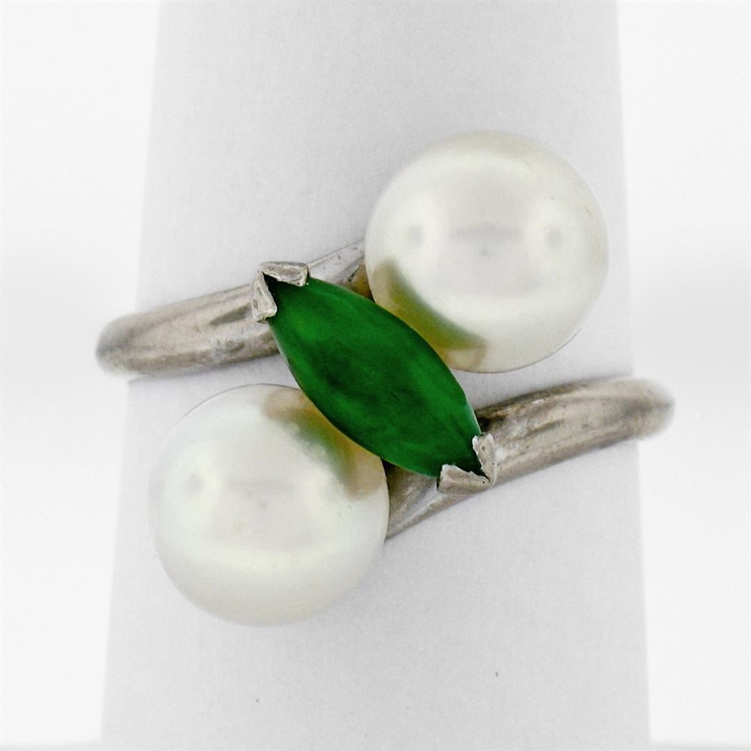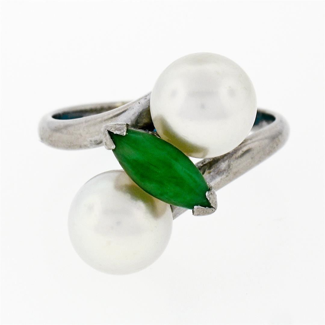 A vintage 14k white gold bypass ring featuring a marquise cabochon cut jade (10.25x4.00mm) set between 2 round cultured pearls (8.35mm). The ring is size 8.5, weighs a total of 6.52 grams, and measures 17.5mm wide.