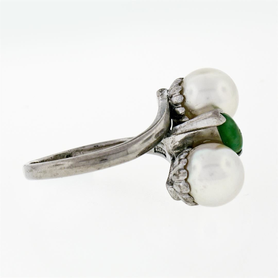 A vintage 14k white gold bypass ring featuring a marquise cabochon cut jade (10.25x4.00mm) set between 2 round cultured pearls (8.35mm). The ring is size 8.5, weighs a total of 6.52 grams, and measures 17.5mm wide.