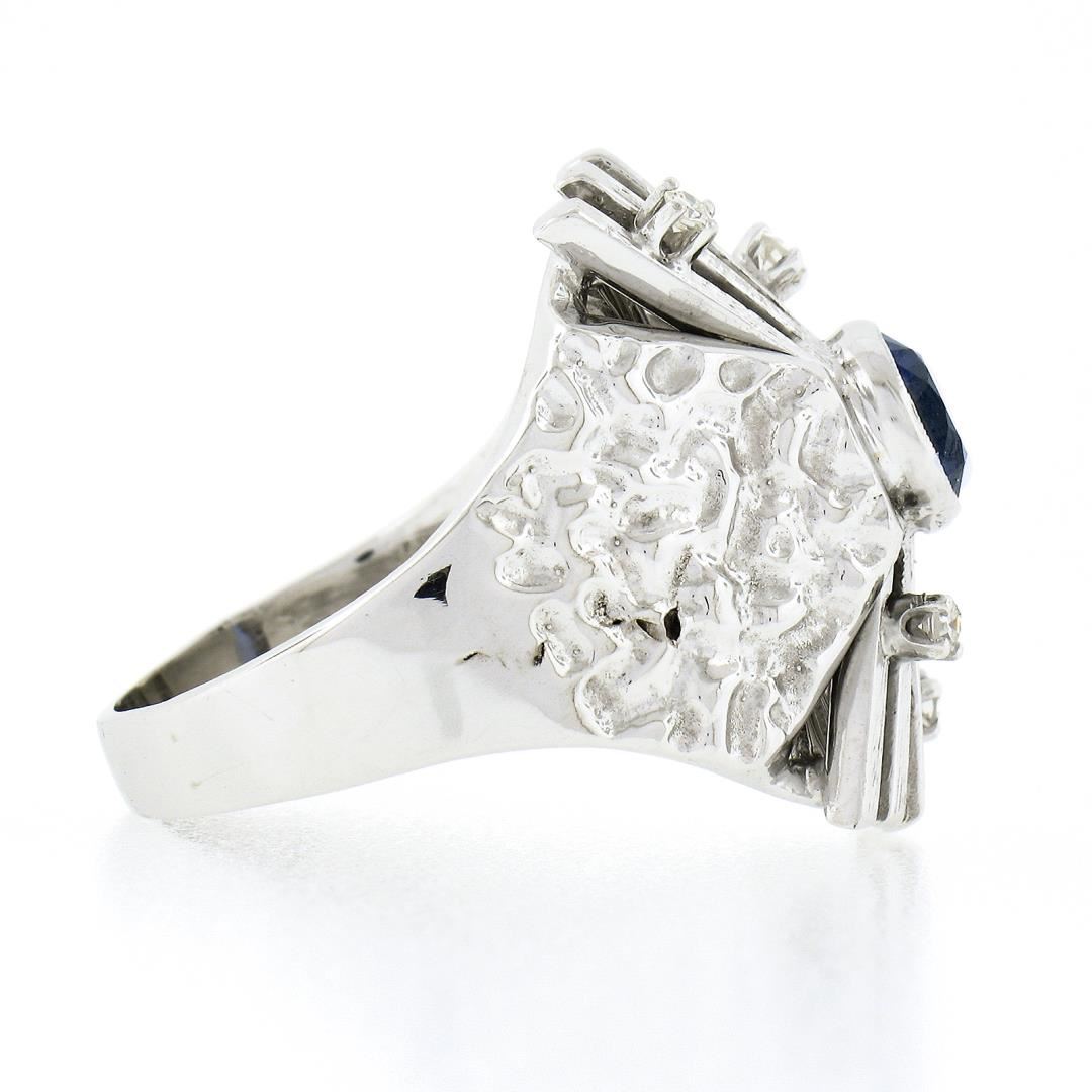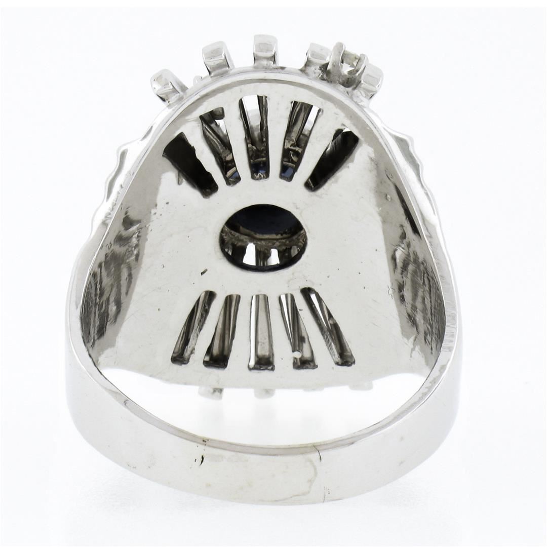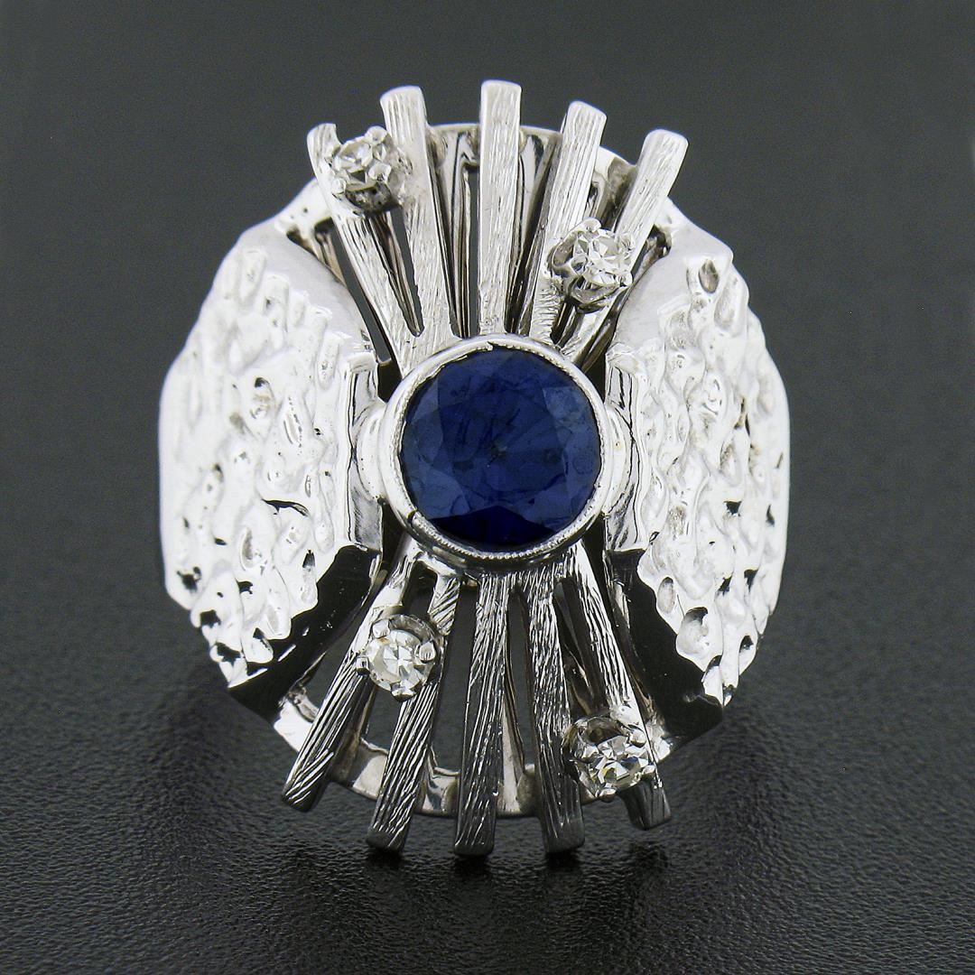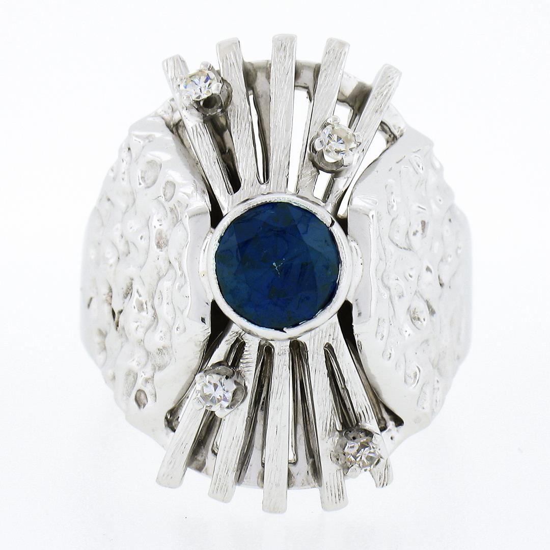 A vintage solid 14k white gold domed ring, with 1 brilliant cut natural sapphire (6.1mm / 1.25ct), and 4 single cut natrual diamonds (G/H - VS2/SI1 ; 0.10ctw). The ring is size 8.5, weighs a total of 11.86 grams, and measures 23.80mm wide.