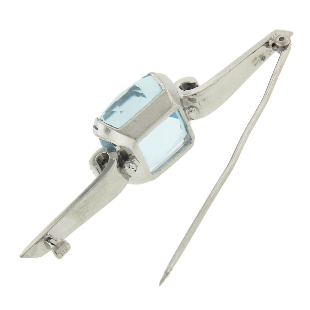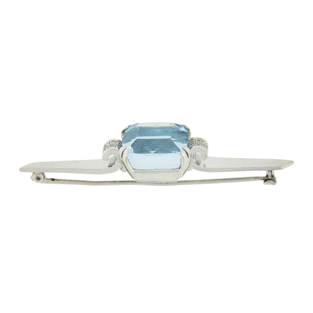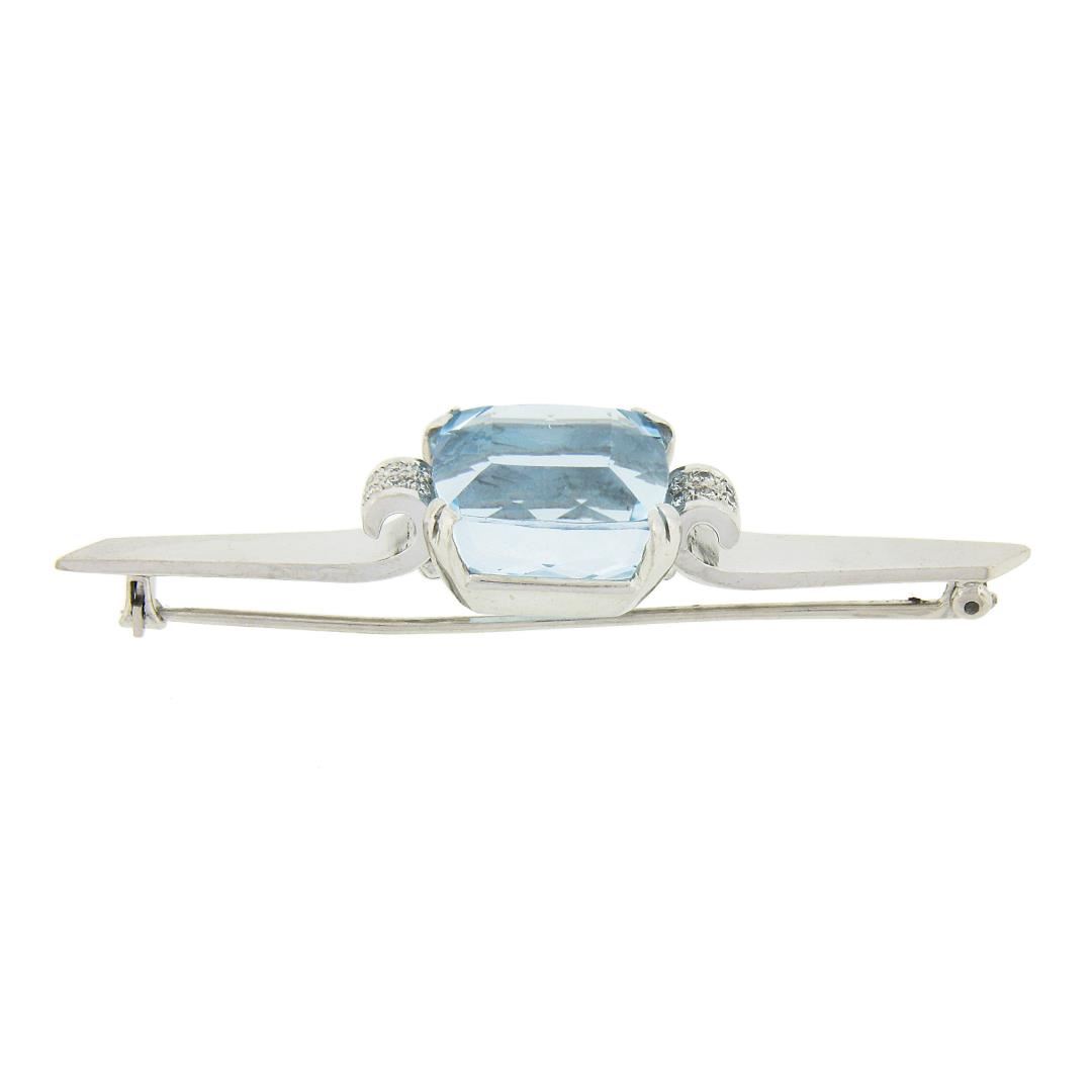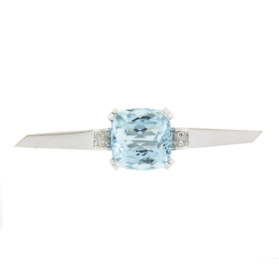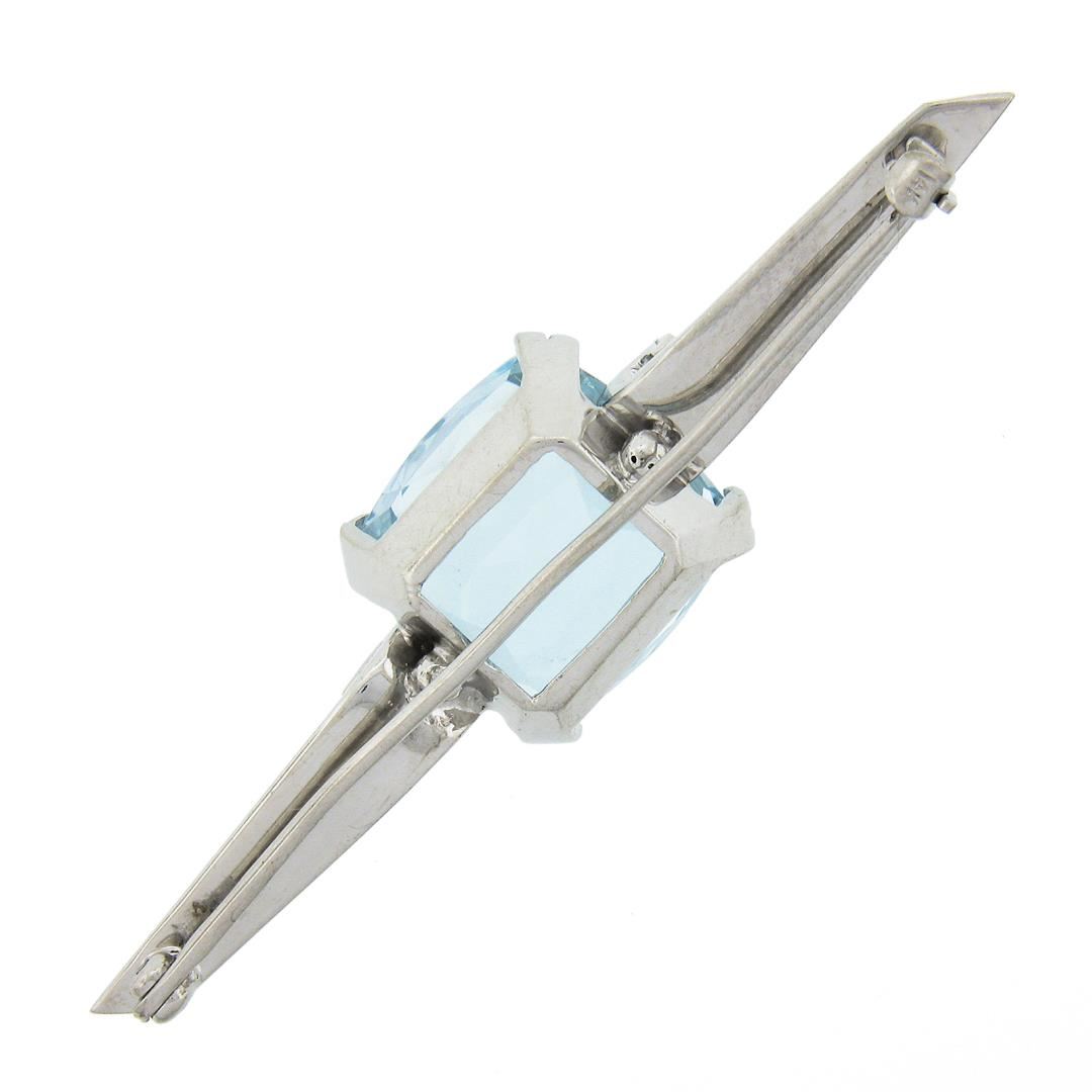 A vintage solid 14k white gold bar pin brooch, with 1 cushion cut natural blue topaz (23ct), and 12 old transitional cut natural diamonds (H/I - VS2/SI1 ; 0.12ctw). Measures 15.95x64.1mm and weighs a total of 15.33 grams.