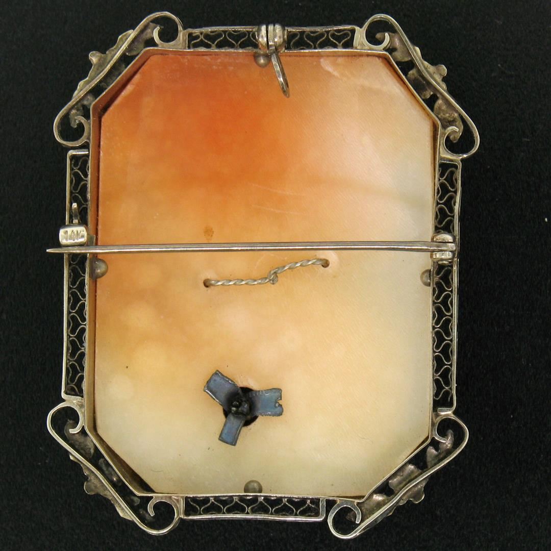 A vintage pendant or brooch featuring a rectangular genuine carved shell cameo (40.00x30.35mm) bezel set in a solid 14k white gold frame accented with an old mine cut natural diamond (J-I1; 0.05ct). Measures 45.92x37.35mm and weighs a total of 12.23 grams