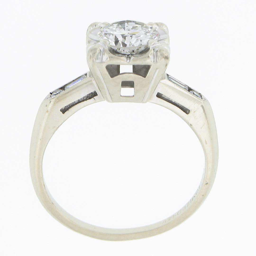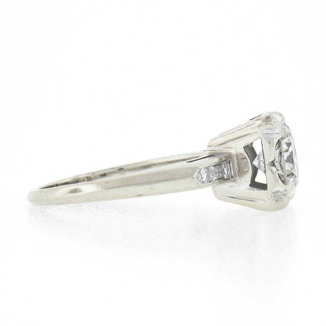 A vintage solid 14k white gold engagement ring, with 1 old transitional cut, 2 baguette cut & 2 single cut natural diamonds (G/H - VS1-SI1 ; 0.94ctw). The ring is size 4.5, weighs a total of 2.70 grams, and measures 8mm wide.