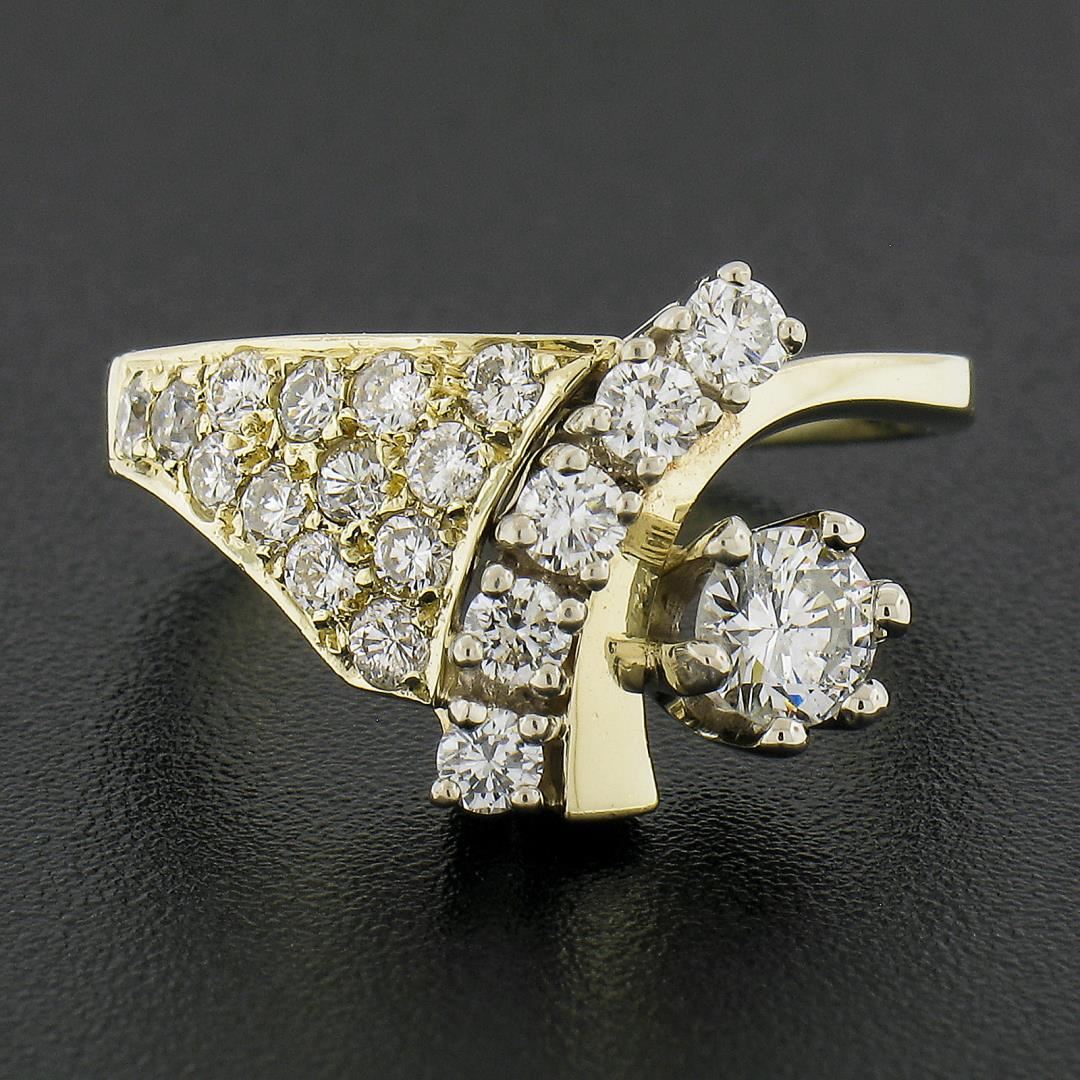 A vintage solid 14k yellow gold ring, with 19 round cut natural diamonds (G/H - SI1-I1 ; 0.90ctw). The ring is size 7.0, weighs a total of 4.82 grams, and measures 12.7mm wide.