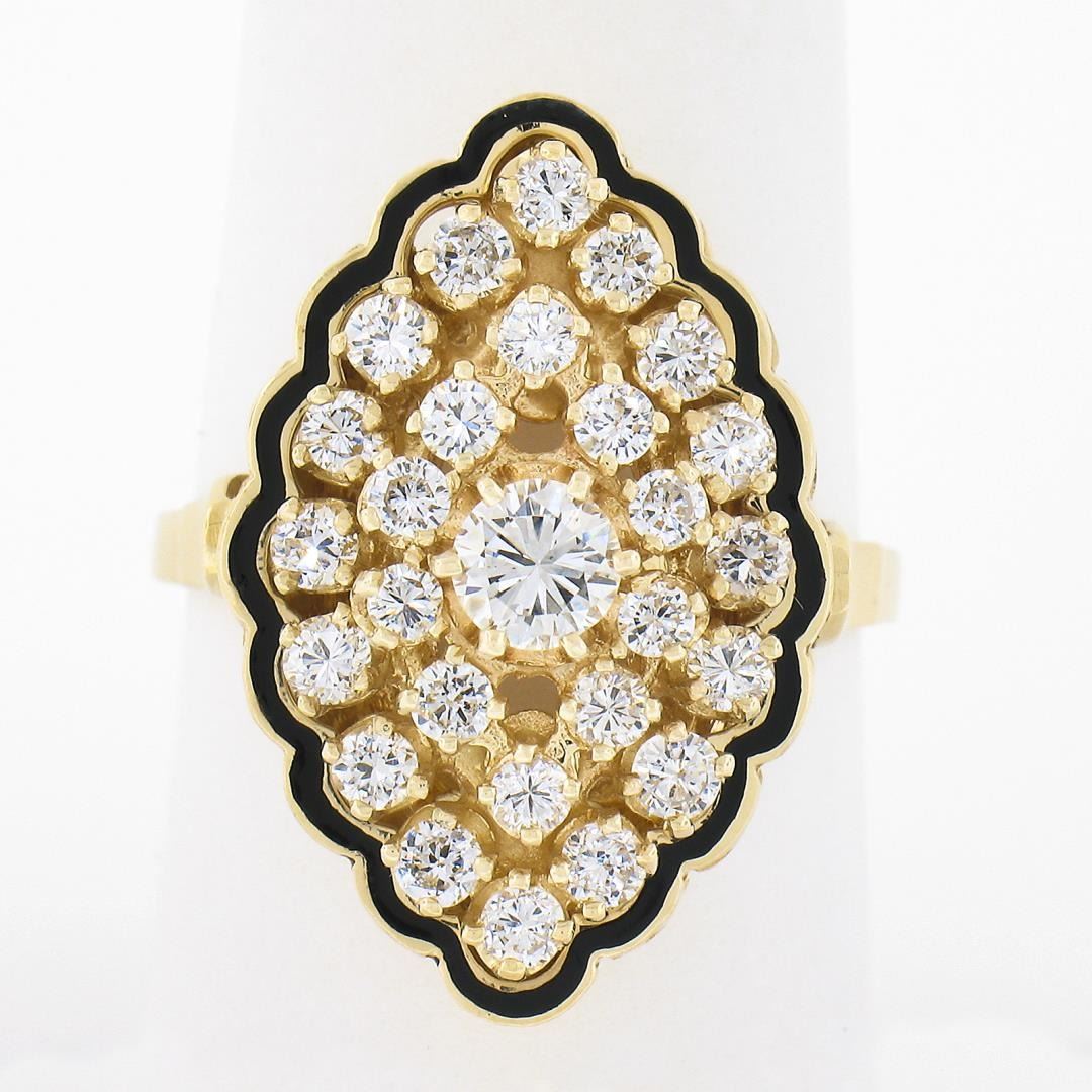 A vintage solid 14k yellow gold cocktail ring, with enamel work and 27 round brilliant cut natural diamonds (G/H - VS2/SI1 ; 1.12ctw). The ring is size 8.0, weighs a total of 7.04 grams, and measures 23.70mm wide.