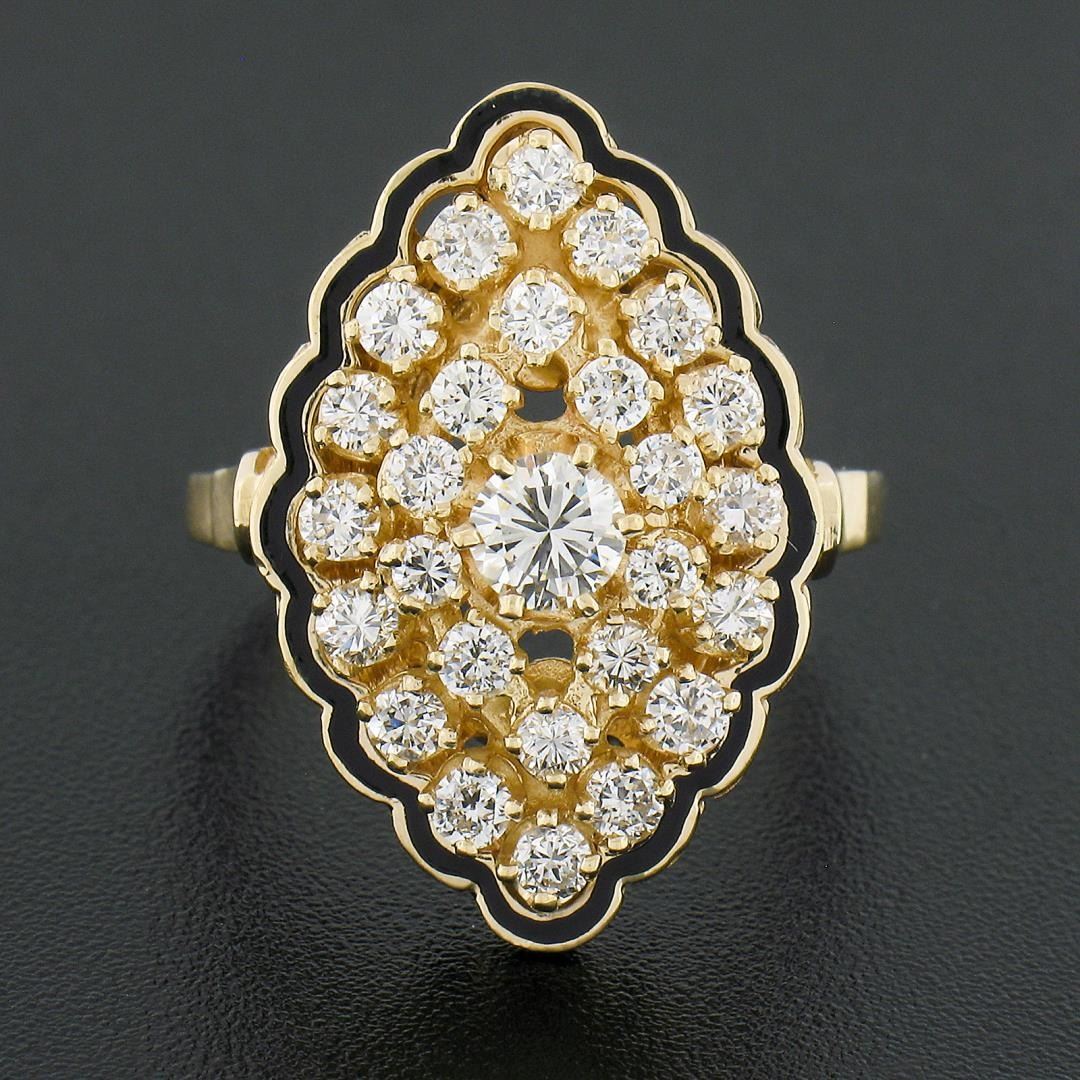 A vintage solid 14k yellow gold cocktail ring, with enamel work and 27 round brilliant cut natural diamonds (G/H - VS2/SI1 ; 1.12ctw). The ring is size 8.0, weighs a total of 7.04 grams, and measures 23.70mm wide.