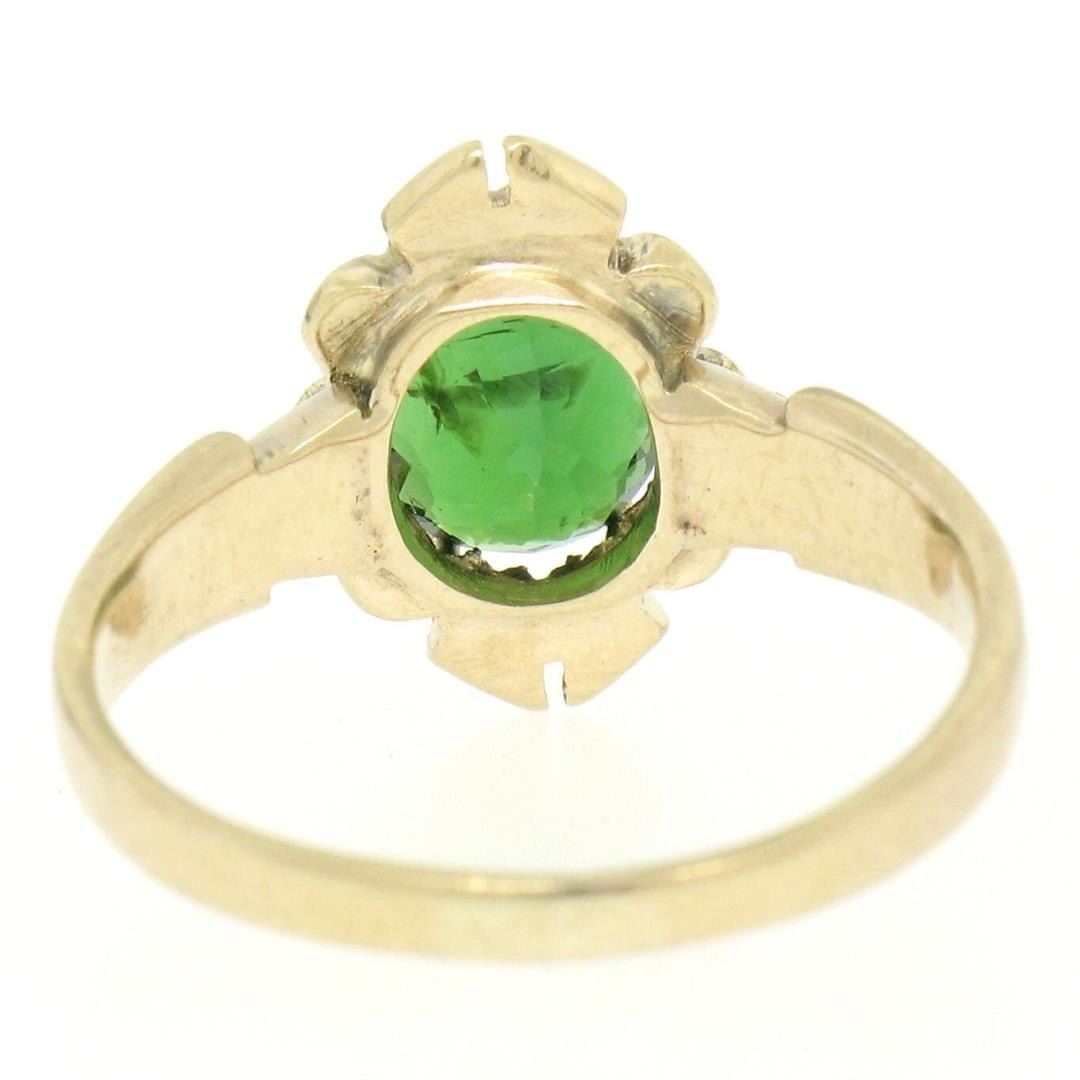 A vintage solid 14k yellow gold cocktail ring, featuring 1 oval cut natural tourmaline (1.00ct), with a halo of 10 single cut natural diamonds (H- SI1; 0.15ctw). The ring is size 5.5, weighs a total of 2.7 grams, and measures 12.5mm wide.