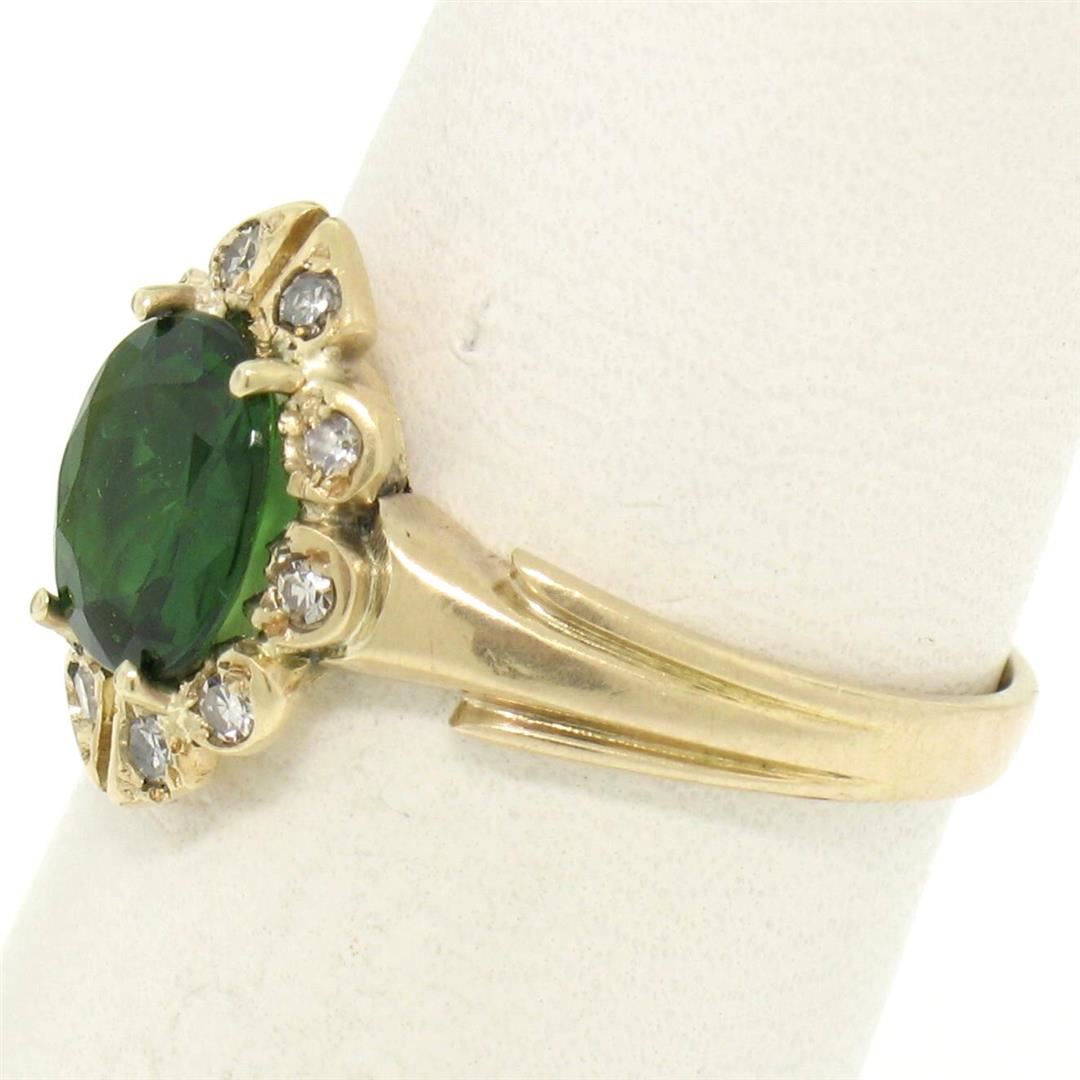 A vintage solid 14k yellow gold cocktail ring, featuring 1 oval cut natural tourmaline (1.00ct), with a halo of 10 single cut natural diamonds (H- SI1; 0.15ctw). The ring is size 5.5, weighs a total of 2.7 grams, and measures 12.5mm wide.