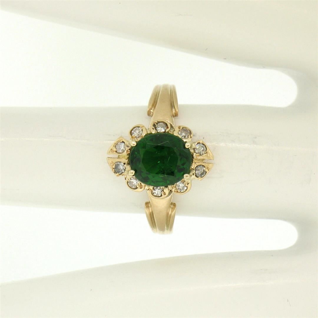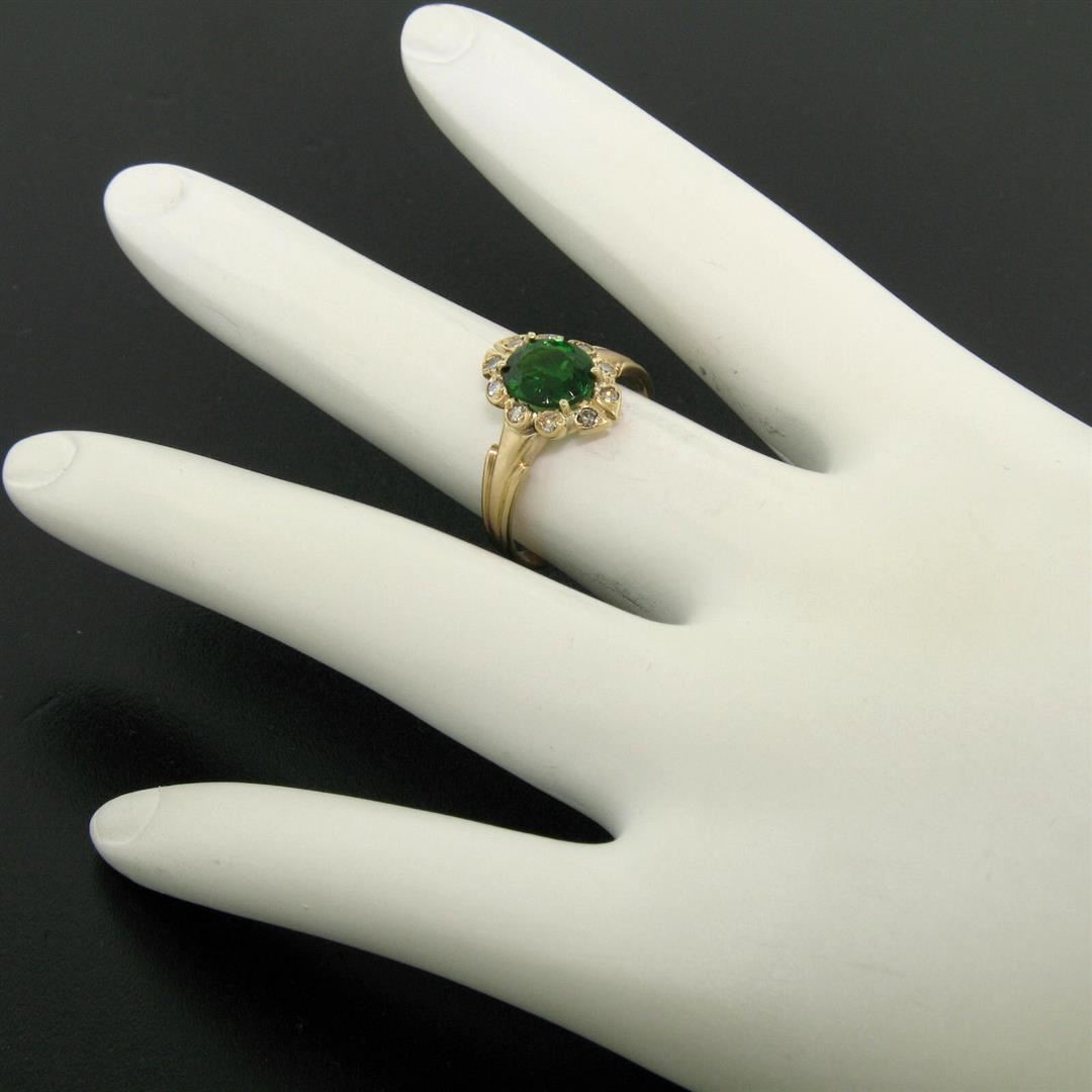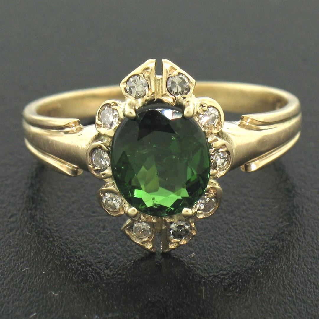 A vintage solid 14k yellow gold cocktail ring, featuring 1 oval cut natural tourmaline (1.00ct), with a halo of 10 single cut natural diamonds (H- SI1; 0.15ctw). The ring is size 5.5, weighs a total of 2.7 grams, and measures 12.5mm wide.