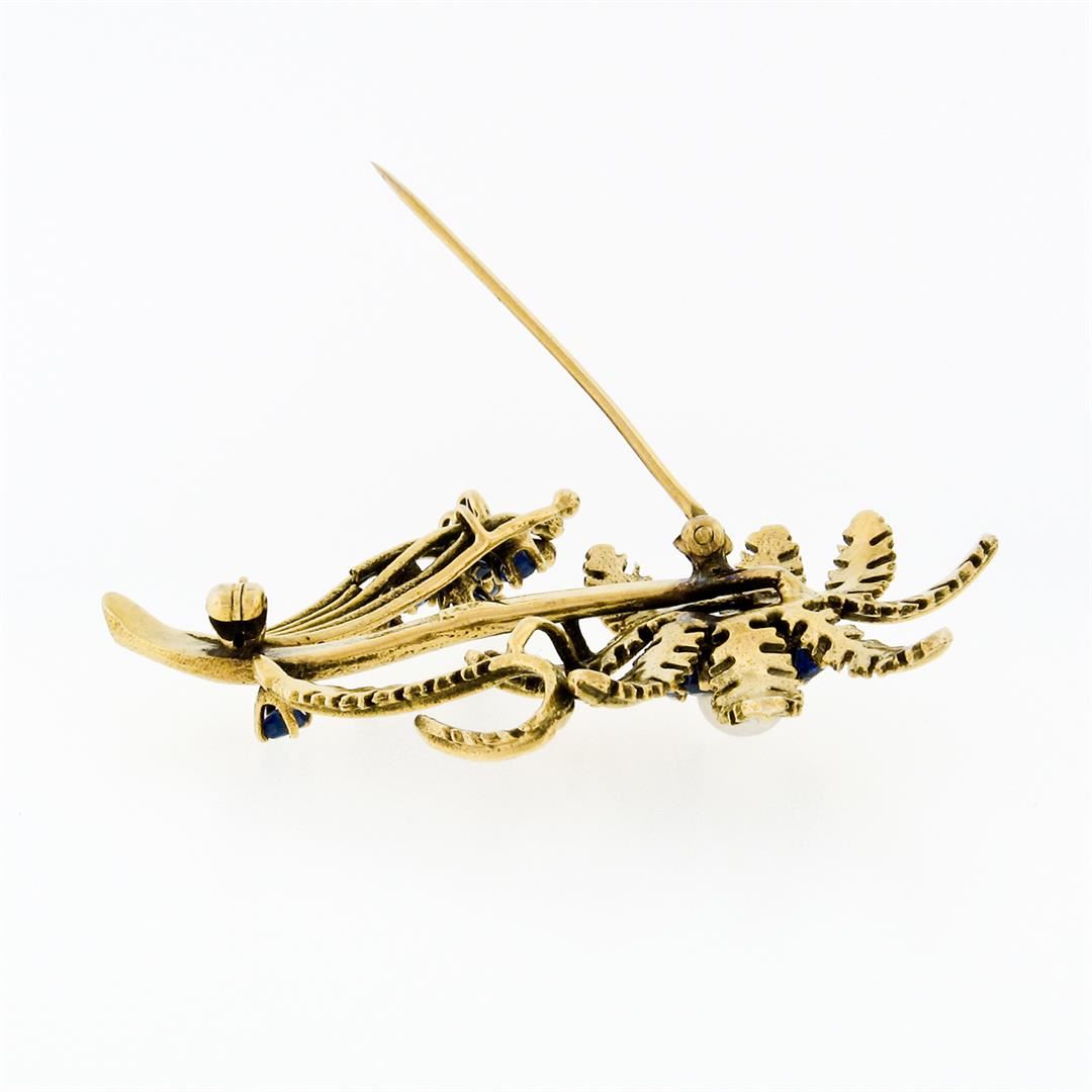 A vintage solid 14k yellow gold flower pin brooch, with 14 round cut natural sapphires (1.20ctw), and 1 round shape natural cultured pearl (5.20mm). Measures 49.60x36.60mm and weighs a total of 10.09 grams.