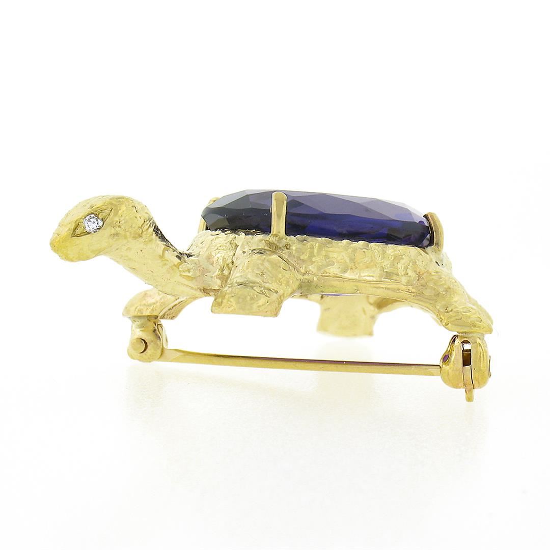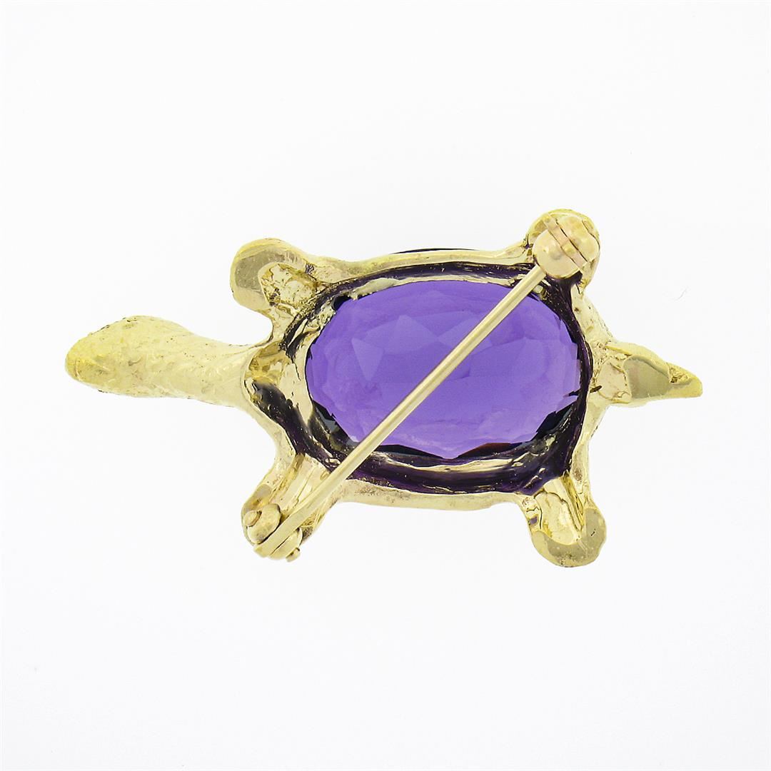 A solid 14k yellow gold turtle pin brooch, with 1 oval brilliant cut natural amethyst (17.56x12.75mm - 11.0ct), and 2 round brilliant cut natural diamonds (F - VS2 ; 0.01ctw). Measures 20.25x35.55mm and weighs a total of 9.0 grams.