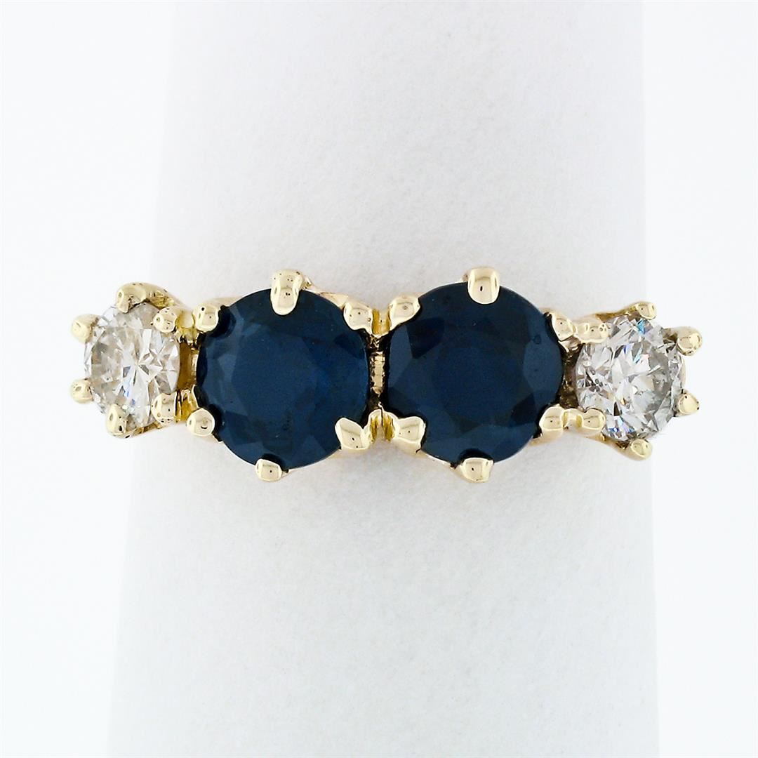 A vintage 14k yellow gold band ring, with 2 round cut natural sapphire (1.70ctw), and 2 round brilliant cut natural diamonds (G/H - SI1/SI2; 0.46ctw). The ring is size 5.0, weighs a total of 2.45 grams, and measures 6.43mm wide.