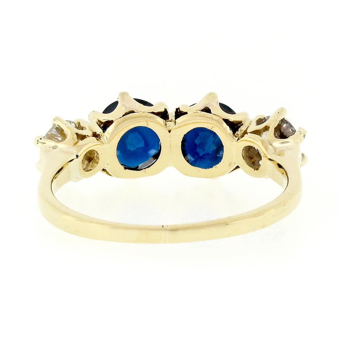 A vintage 14k yellow gold band ring, with 2 round cut natural sapphire (1.70ctw), and 2 round brilliant cut natural diamonds (G/H - SI1/SI2; 0.46ctw). The ring is size 5.0, weighs a total of 2.45 grams, and measures 6.43mm wide.
